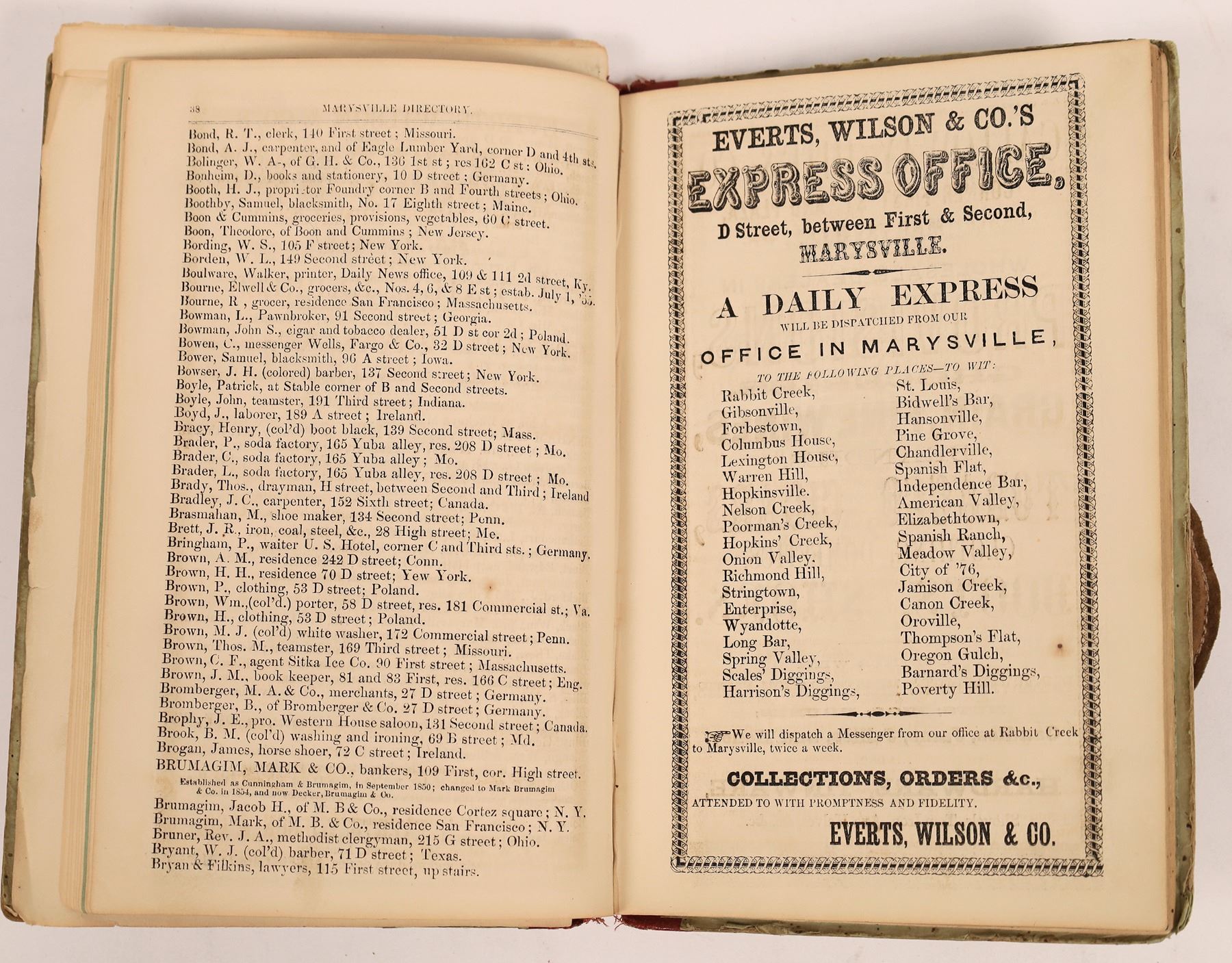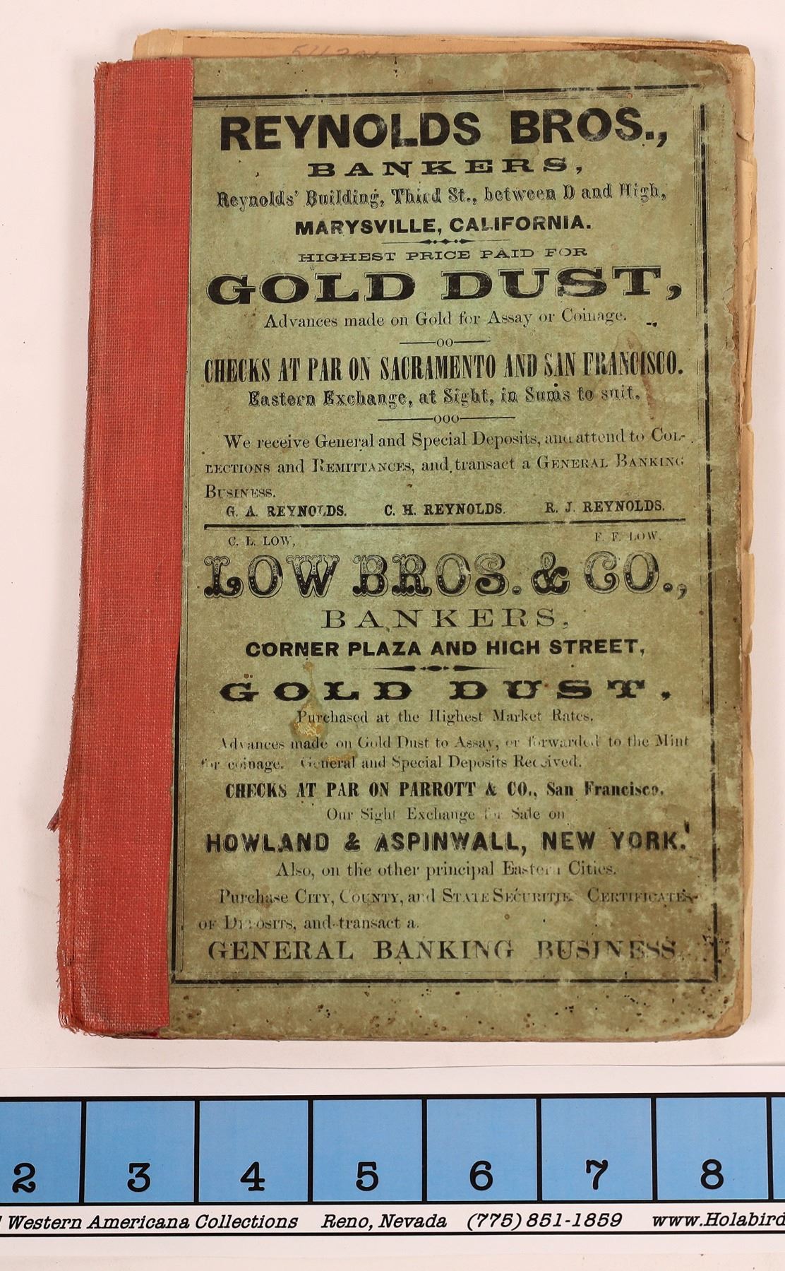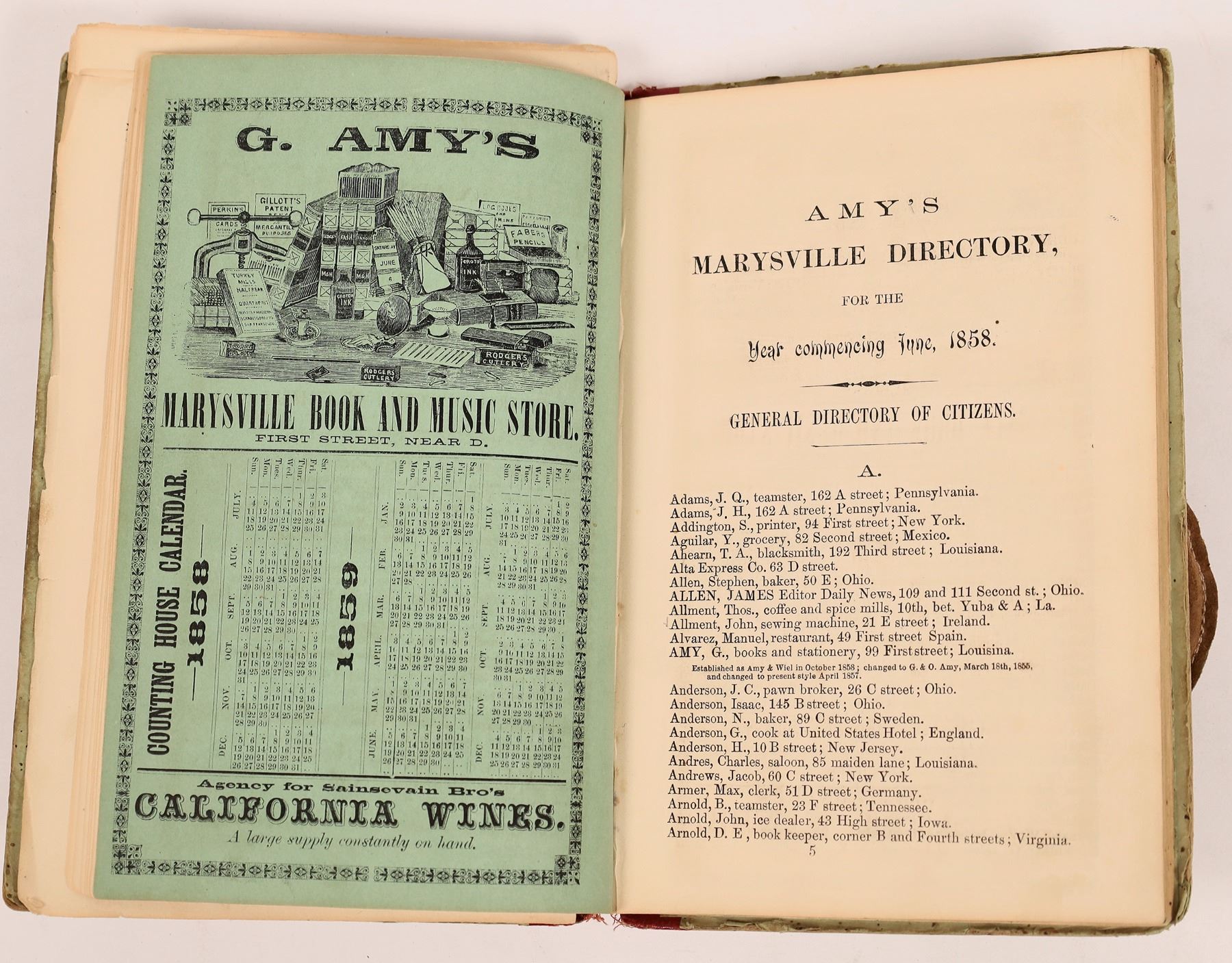 Amy's Marysville Directory, for the Year Commencing June 1858, Being a Register of this City and of the County of Yuba, Embracing a General and Business Register of Citizens, with Statistical Tables, Historical References, Biographical Notes, Etc. Prefaced by a History of the County of Yuba. Compiled by Mix Smith and G. Amy. Printed at the Daily News Book and Job Office. 108 pages. Binding issues, some pages are loose.