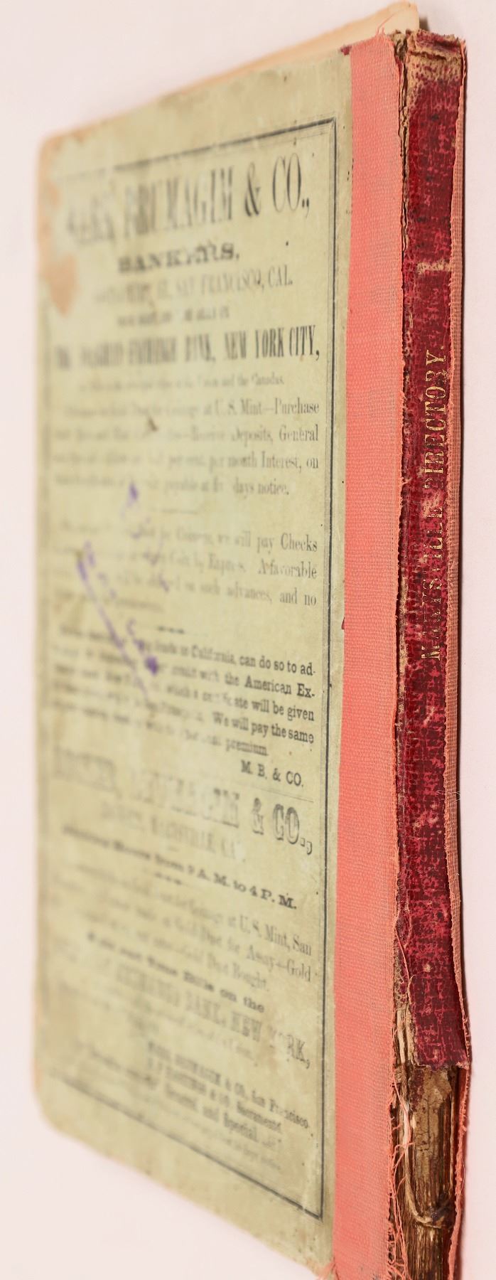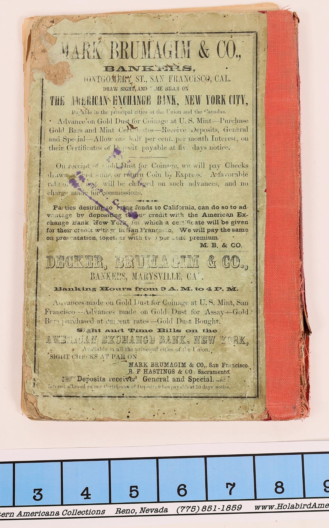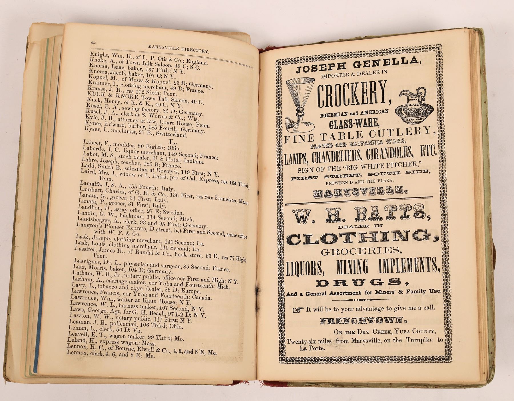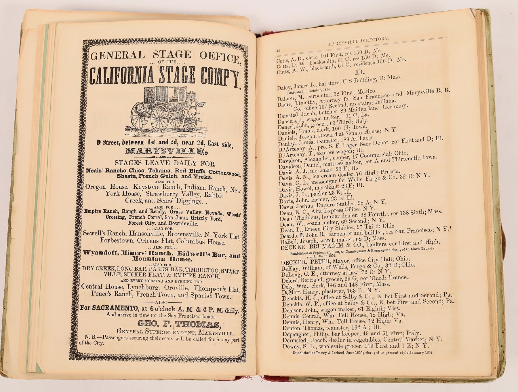 Amy's Marysville Directory, for the Year Commencing June 1858, Being a Register of this City and of the County of Yuba, Embracing a General and Business Register of Citizens, with Statistical Tables, Historical References, Biographical Notes, Etc. Prefaced by a History of the County of Yuba. Compiled by Mix Smith and G. Amy. Printed at the Daily News Book and Job Office. 108 pages. Binding issues, some pages are loose.