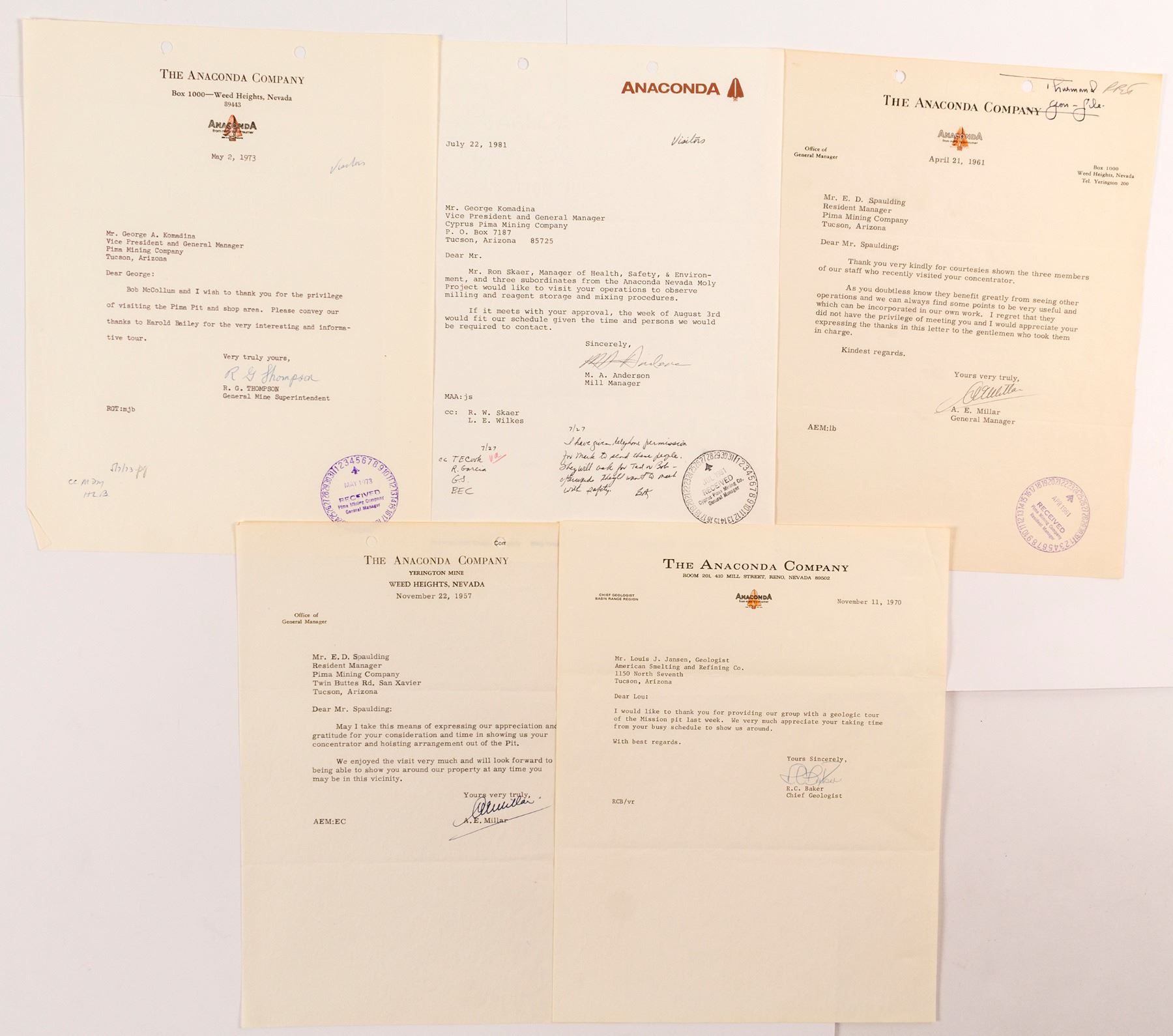 5 letters regarding geologic tours of the Anaconda Mine operations in Weed Heights, Nevada.