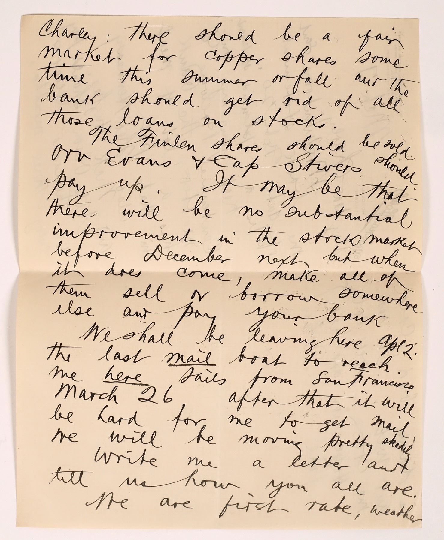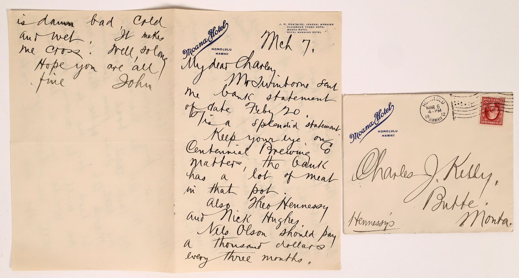 Handwritten letter on stationary from the Moana Hotel, Honolulu, Hawaii postmarked March 6, 1912. Addressed to Charles J. Kelly, Butte, Montana. Kelly by 1911 was vice president of Anaconda Copper, a successful lawyer and politician. The Hennessy Company was a mercantile business in Butte, Montana, that operated in conjunction with the Anaconda Copper Mining Company. Branch stores were later established around the state. Contents of the letter are entertaining: "Keep your eye on Centennial Brewing Co. matters, the bank has a lot of meat in that pot." Signed John, he is cross at the "damn bad, cold and wet," weather in Honolulu.