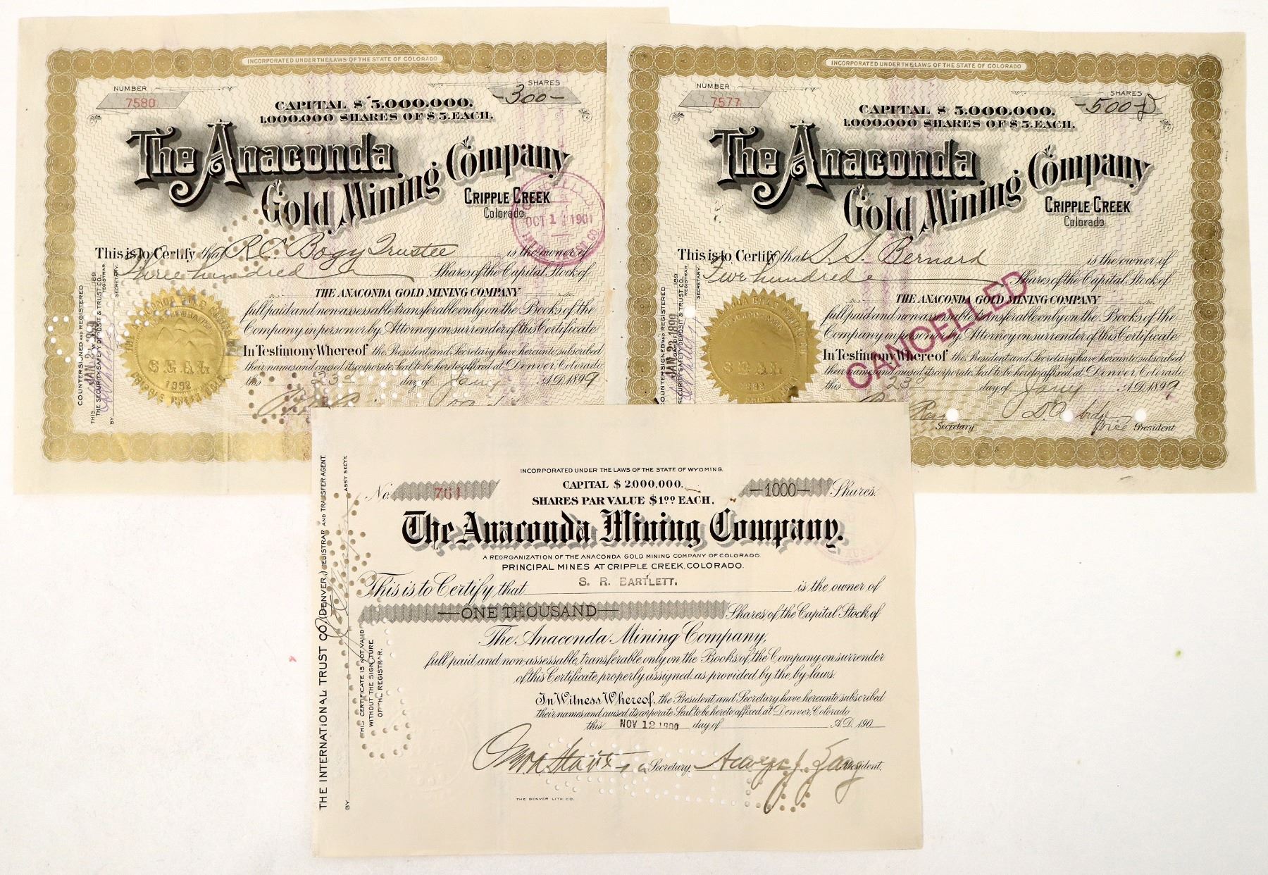 A group of three stock certificates from the Anaconda gold Mining Company of Colorado, including two from 1899 and one from 1900. All three bear the official seal of the company, as well as the signatures of the company's president and secretary. Two have been cancelled using a hole punch cancellation, and one with a stamp cancellation.