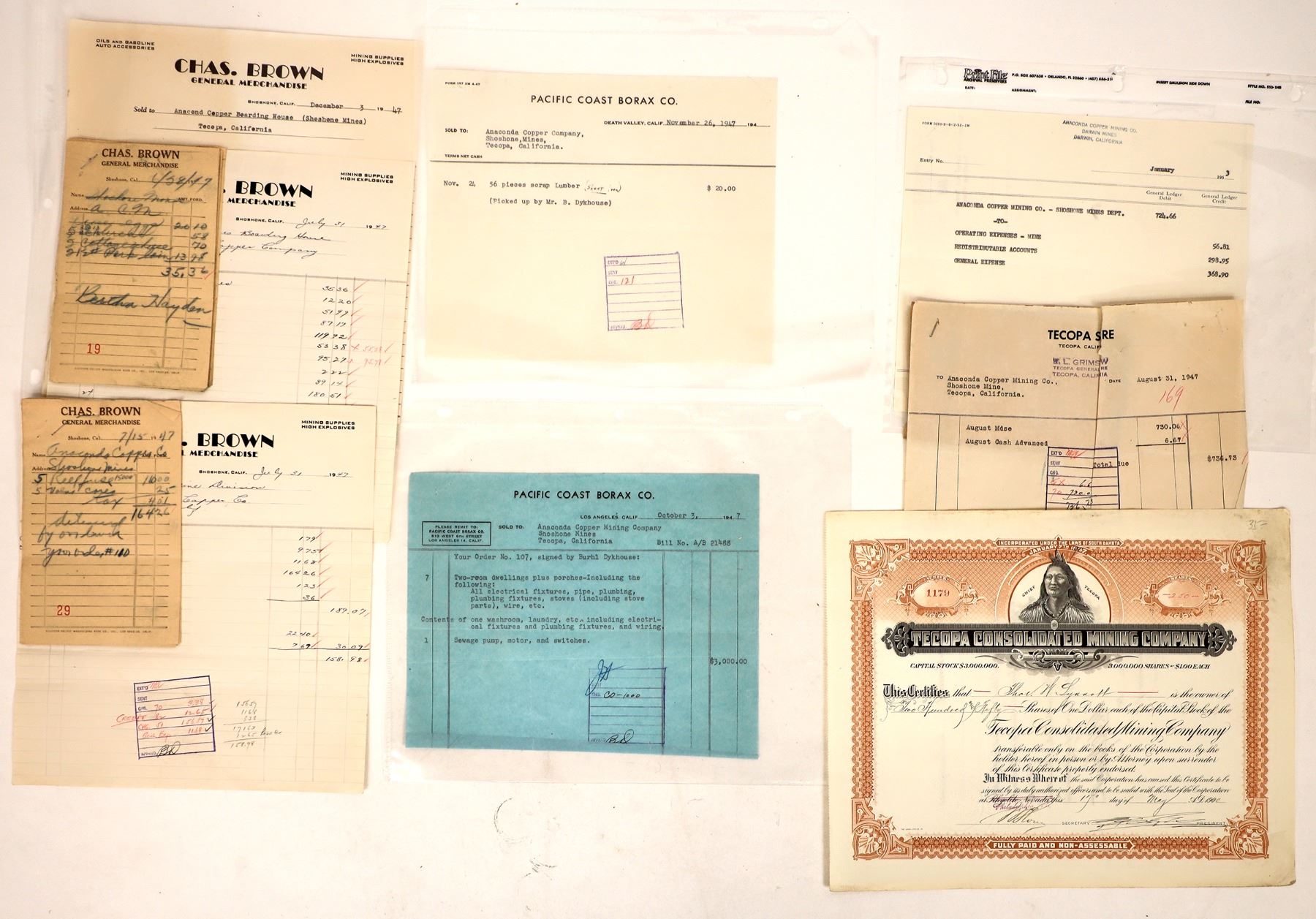About 20 1947 Anaconda Copper receipts from Shoshone, CA. Other Anaconda receipts from Tecopa. See photo. Issued 1906 Tecopa Cons. Mining stock.