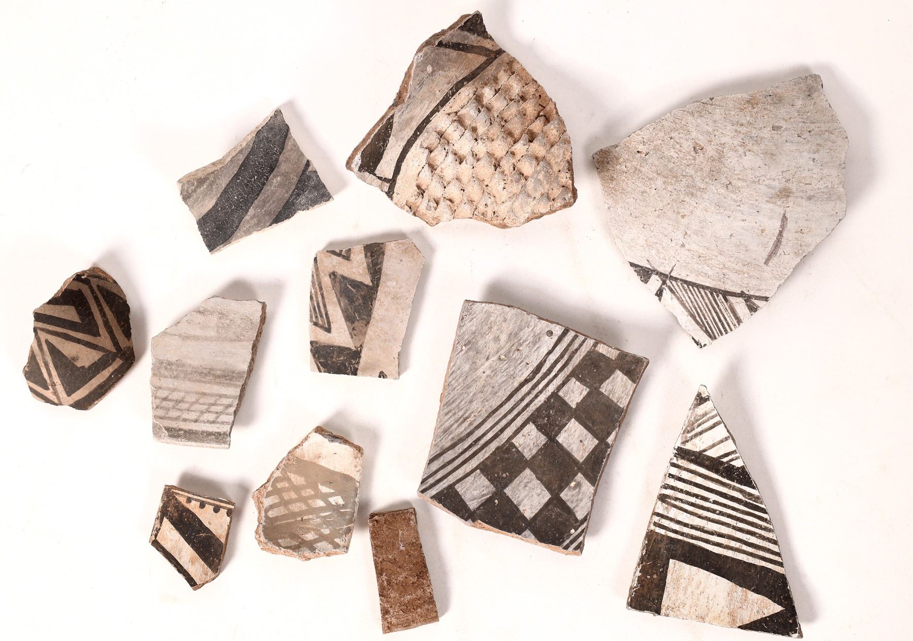 This lot holds eleven pieces of Anasazi (Ancient Puebloan) pottery shards. There are four pieces in the 3in .size with black on white ware decorated inside or outside. One piece is of corrugated construction and appears to have been pressed to give the visual effect; yet the rim is expanded, smoothed, and painted black on white. Other pieces have intricate geometric designs indicating that the potter was both a skilled technician and an artist to complete painted geometrics on the inside of a jar! Is it possible that multiple people completed each piece; a potter, a painter, and a fire kiln technician? The smaller pieces are all black on white with significant geometric designs. From the Bracken collection. Please see photos for details.