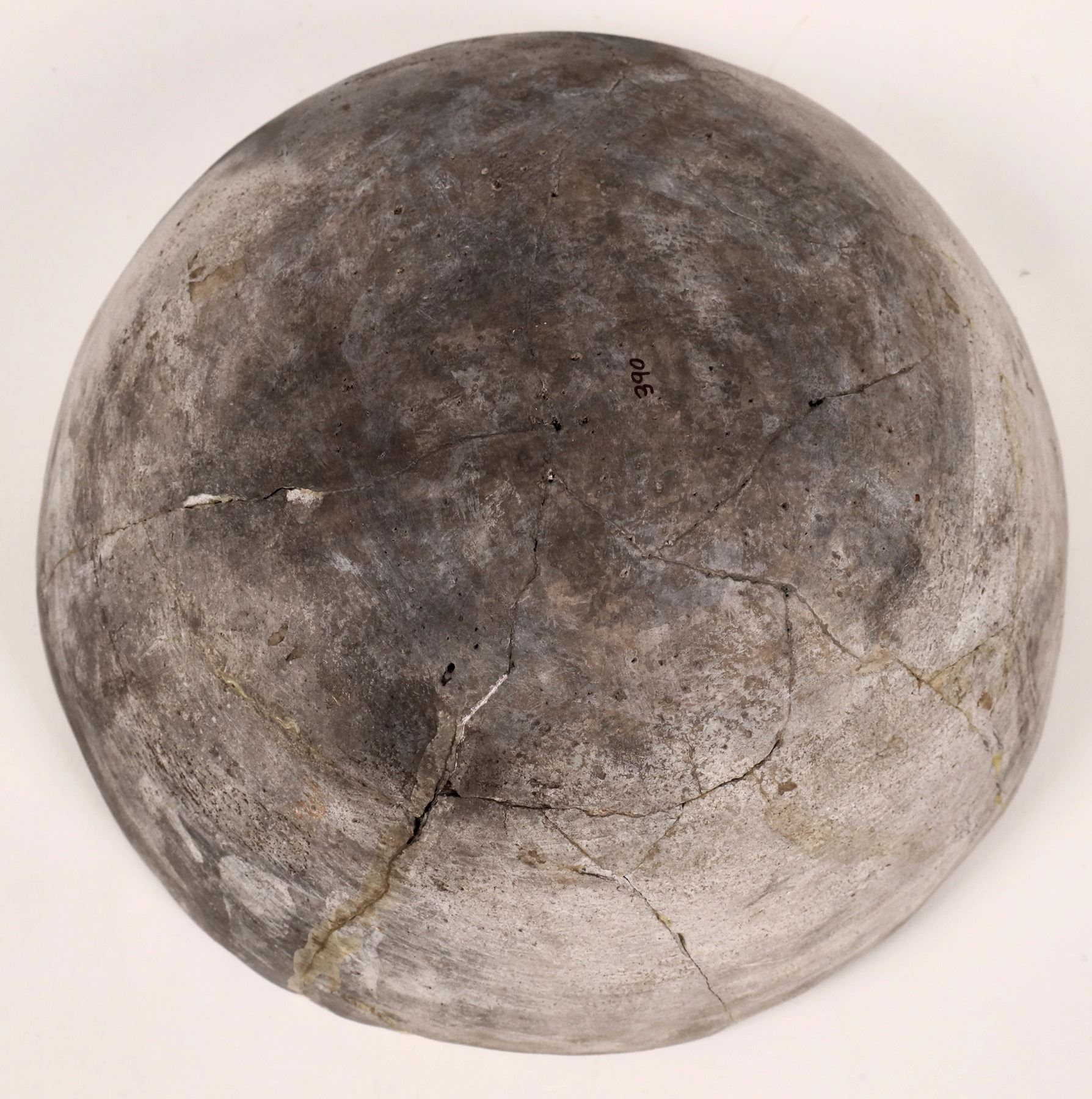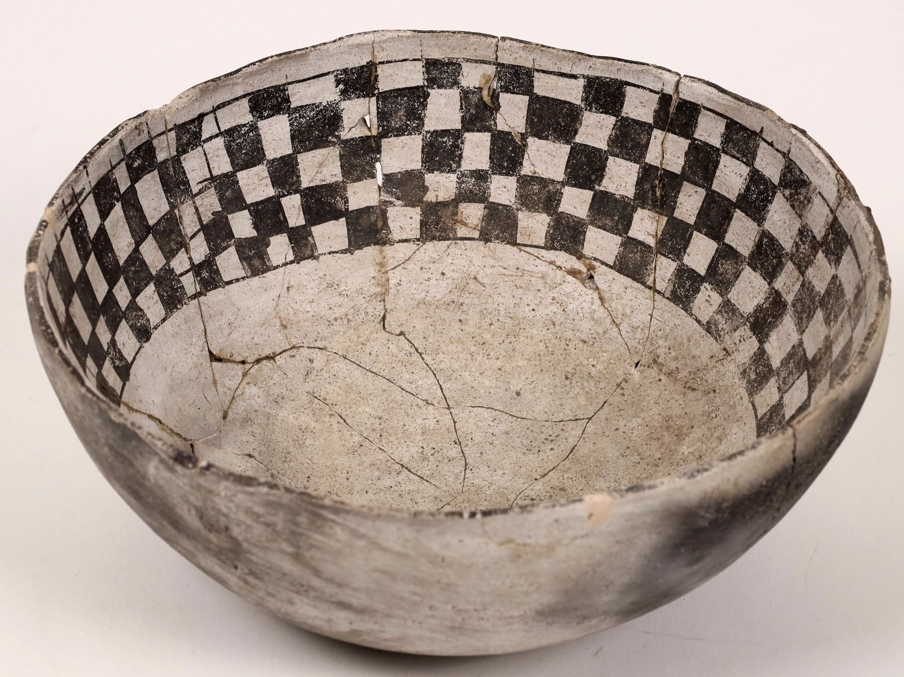 Reconstructed Anasazi bowl. Pit-fired with black on white checkerboard internal design. 3.5"x 8.75". .5", lip chip.