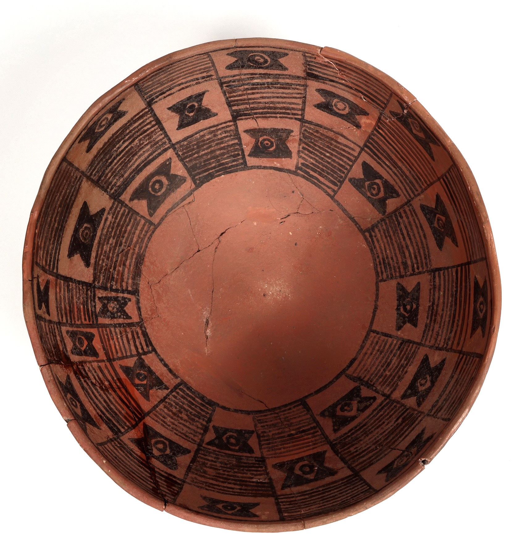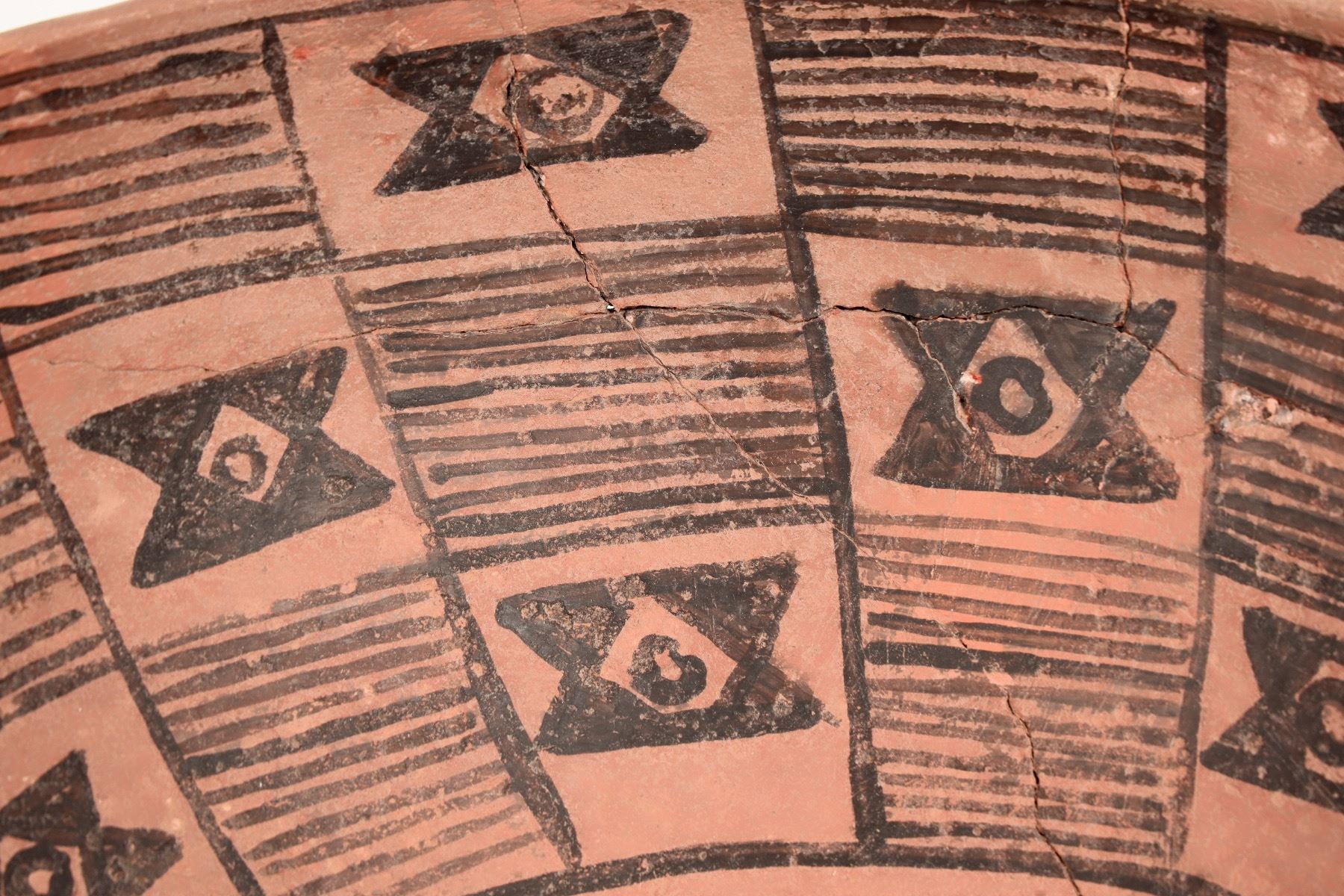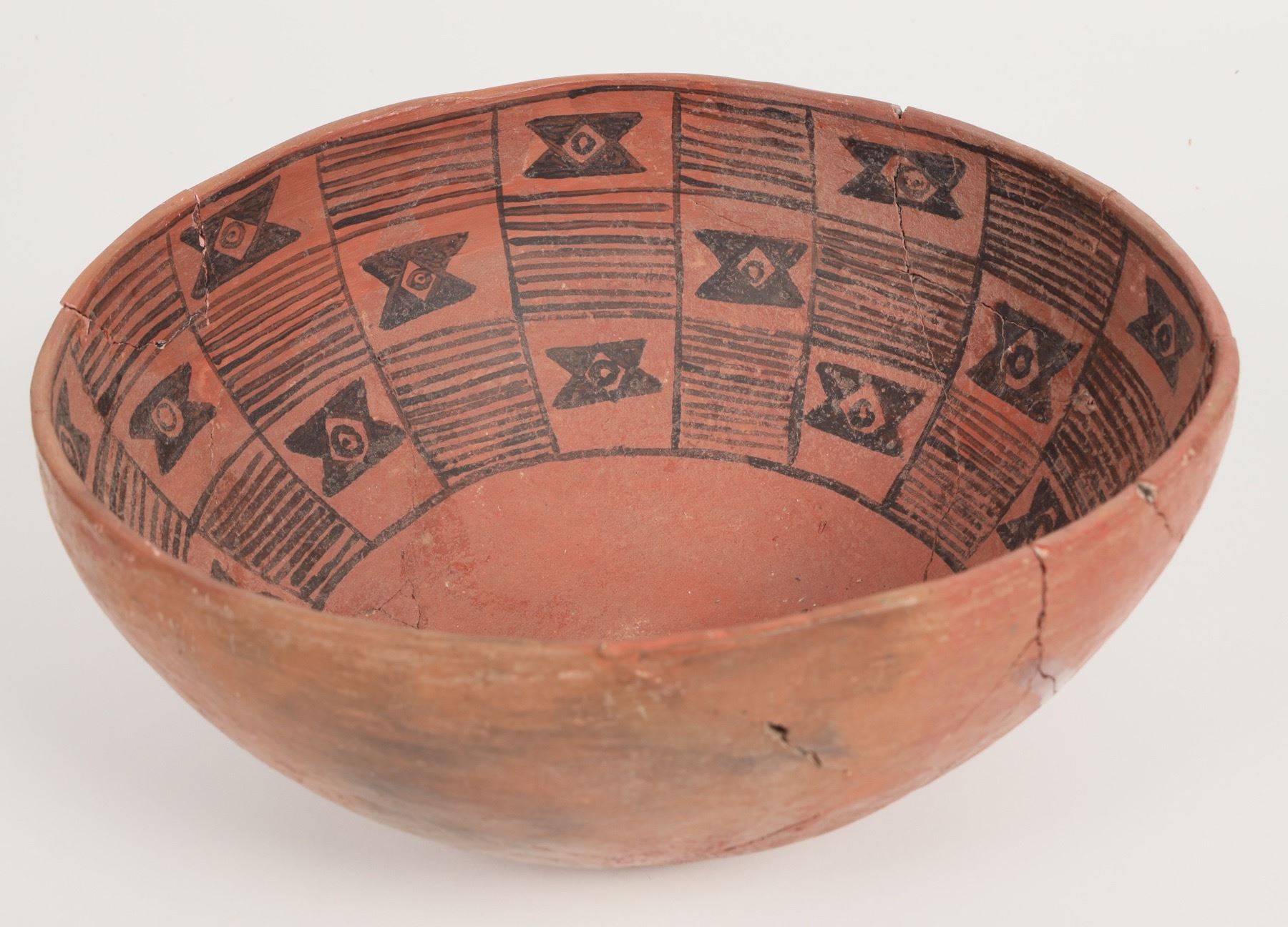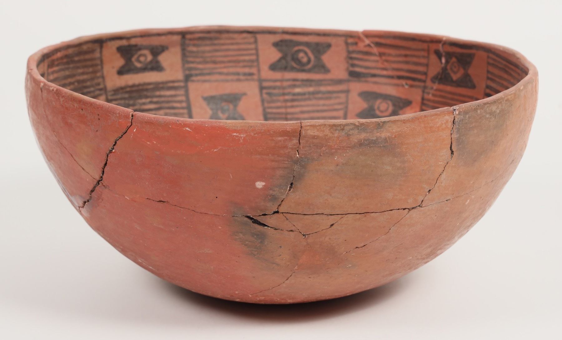 Puerco Valley in the Upper San Juan Basin, the Central Anasazi branch of the Southern Cibola tradition. The hard, red-slipped vessel has geometric designs painted in a black mineral pigment with interlocking frets and triangles. Northern San Juan or Mesa Verde Red Wares reflect distinct decorated pottery forms produced from the Early Pueblo I to Middle Pueblo II periods. Southeastern Utah is assumed to be the principal source of San Juan Red Ware vessels. Gray core is visible on this piece, which may indicate the use of carbonaceous gray clays that are high in iron content. Approx 5.5" x 11.5" across top. Ref: New Mexico Office of Archaeological Studies,C. Dean Wilson 2012.