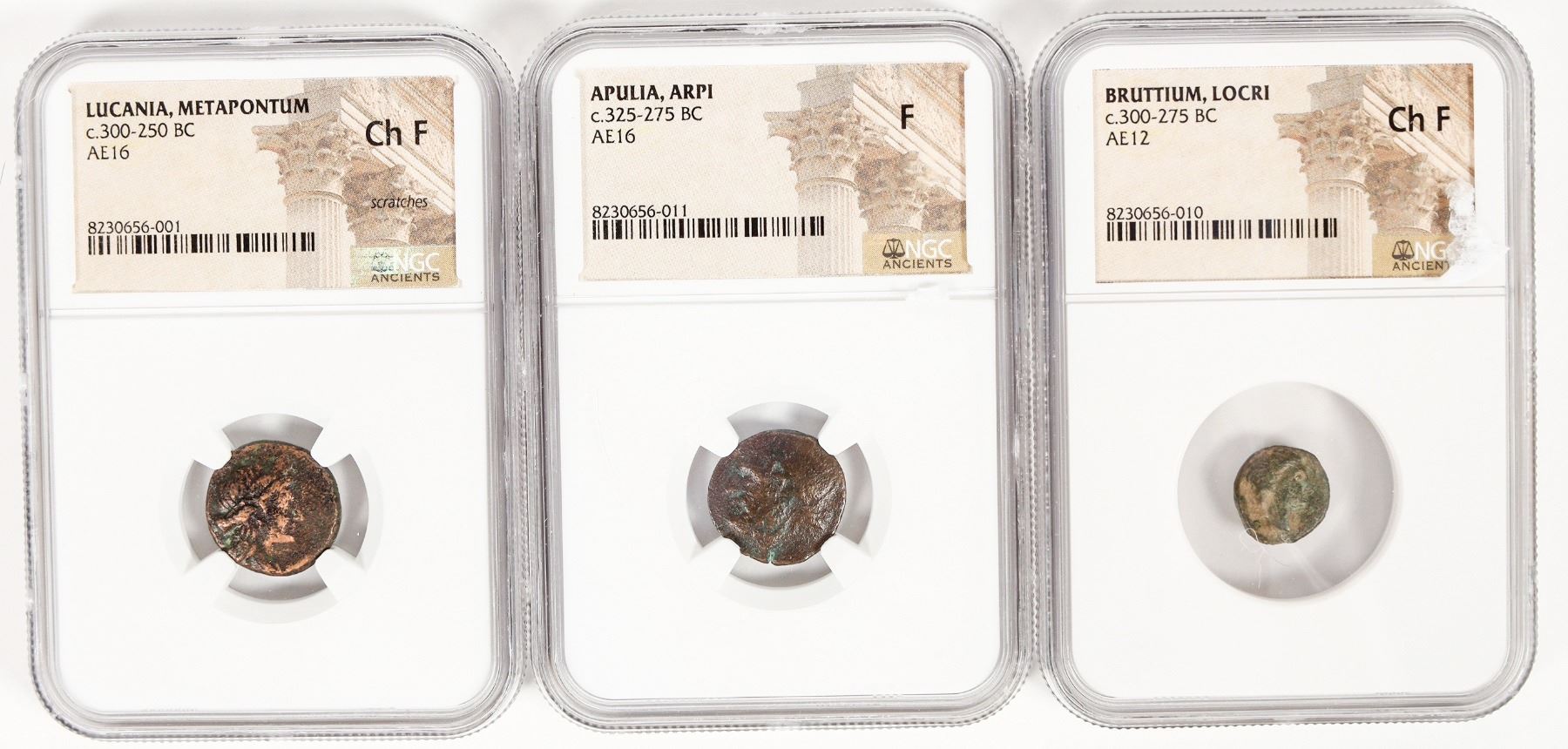 Three NGC certified bronze coins: 1) Lucania, Metapontum; c300-250 BC; AE16; graded Choice Fine. 2) Apulia, Arpi; c325-275 BC; AE16; graded Fine. 3) Bruttium, Locri; c.200-275 BC; AE12; graded Choice Fine.