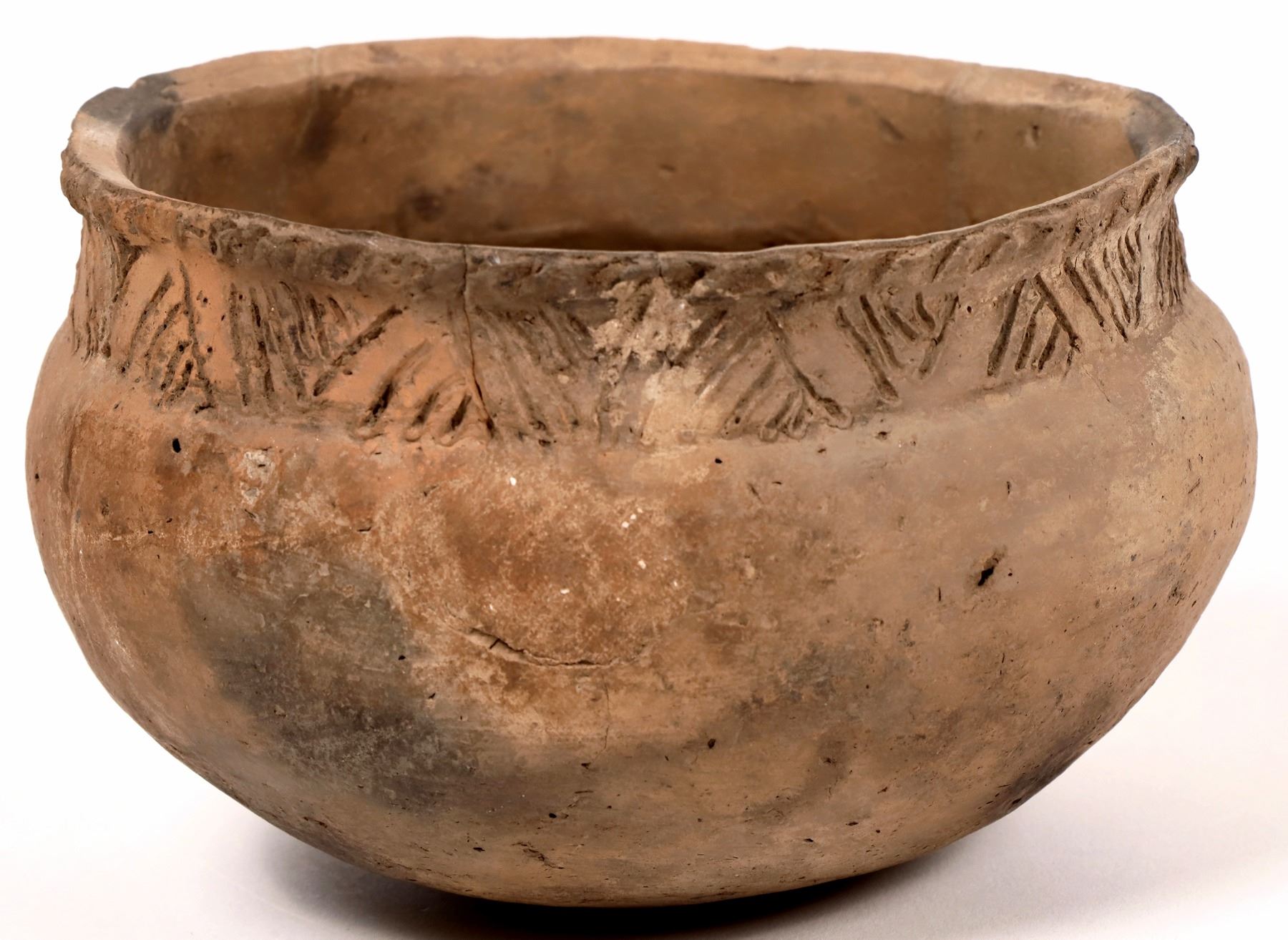 Traditional Caddo rounded base bowl with flared rim with hash mark design. 3"x4.25", no apparent chips or cracks.