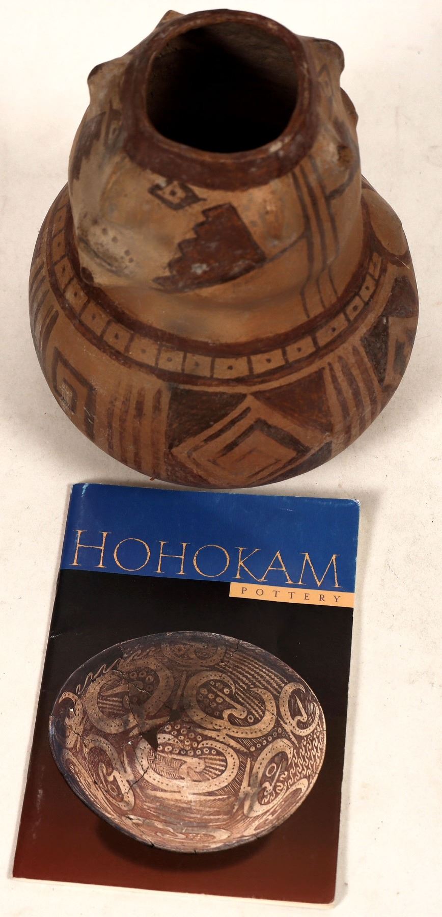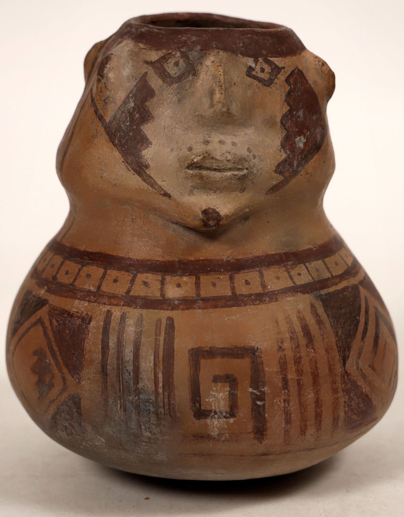 Possibly from Hohokam area around Casa Grande, AZ. Two sided faces on rounded base pot. Red and black on buff. Very good condition. Approximately 4.5" diameter x 6.5" high