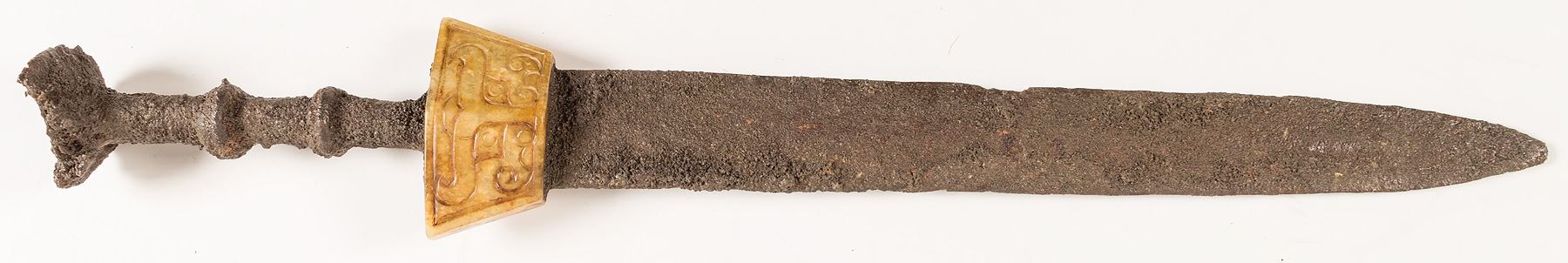 This knife appears to be very old, possibly as old as 1000 years. it is 16.5" long and has a prior collection marking but the source is unknown. The carved rust color jade guard has an interesting pattern. Consigned by The Cowboy Connection in Livingston, MT. State: City: Date: ID# 49268
