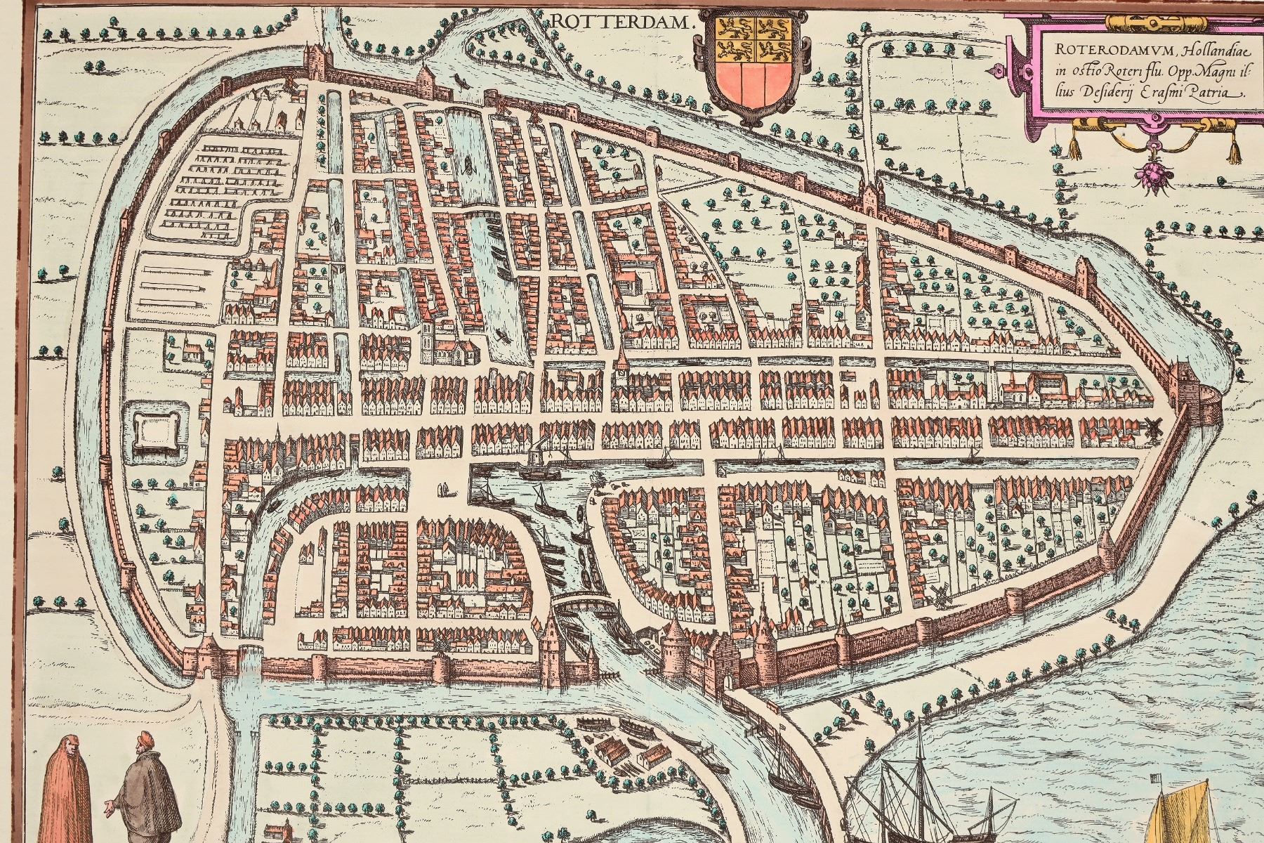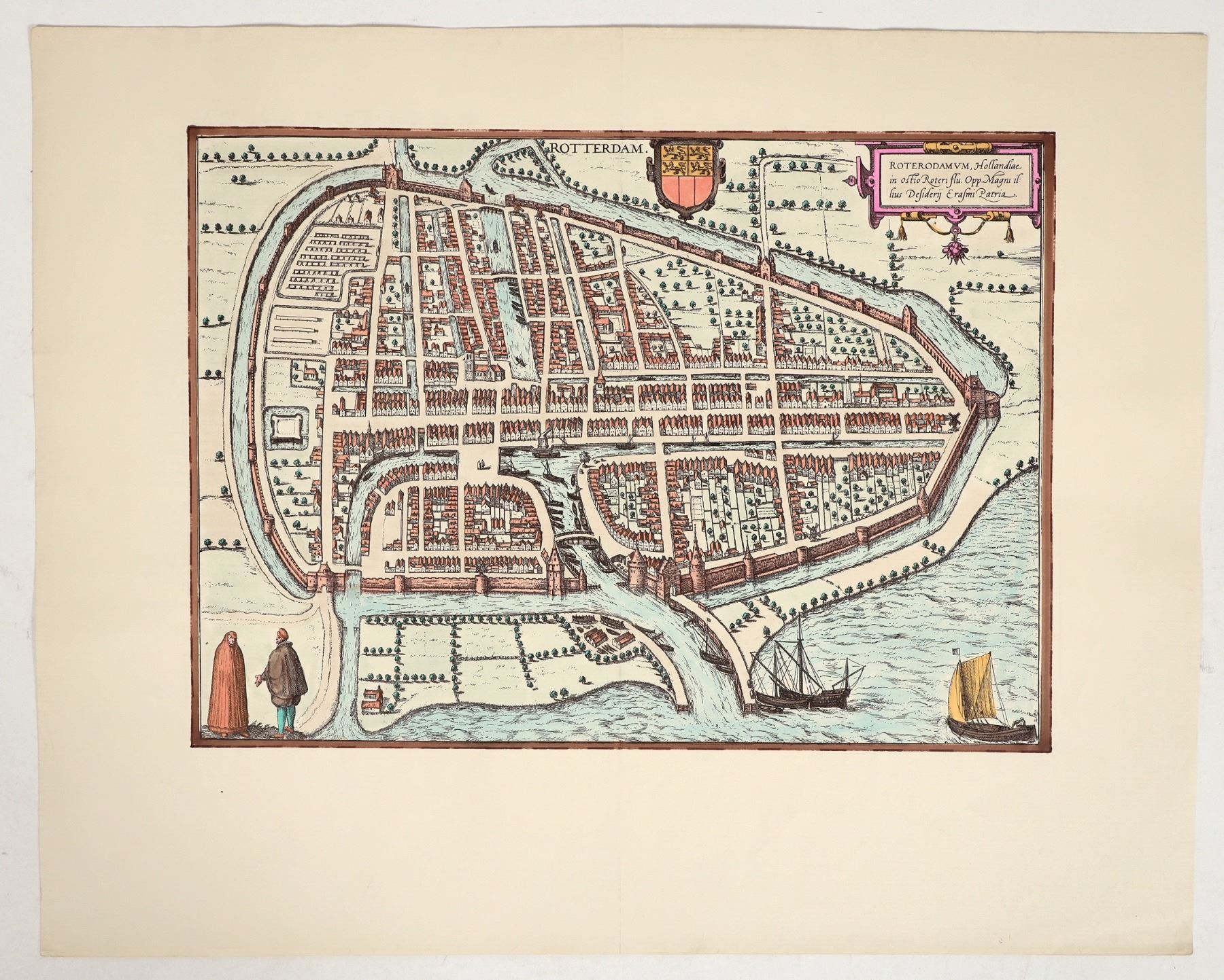 Map of Rotterdam, 1588-97. By George Braun and Frans Hogenberg. Copper-engraving, hand colored. 21 x 17 ". Story on back. Map appears almost new.