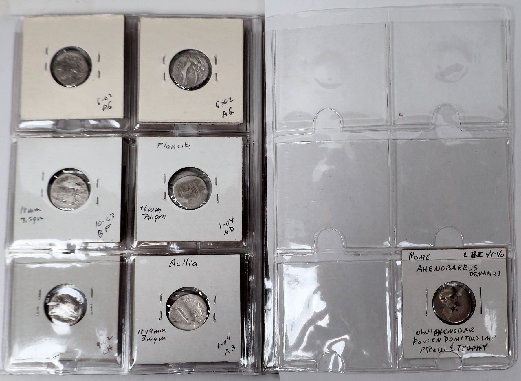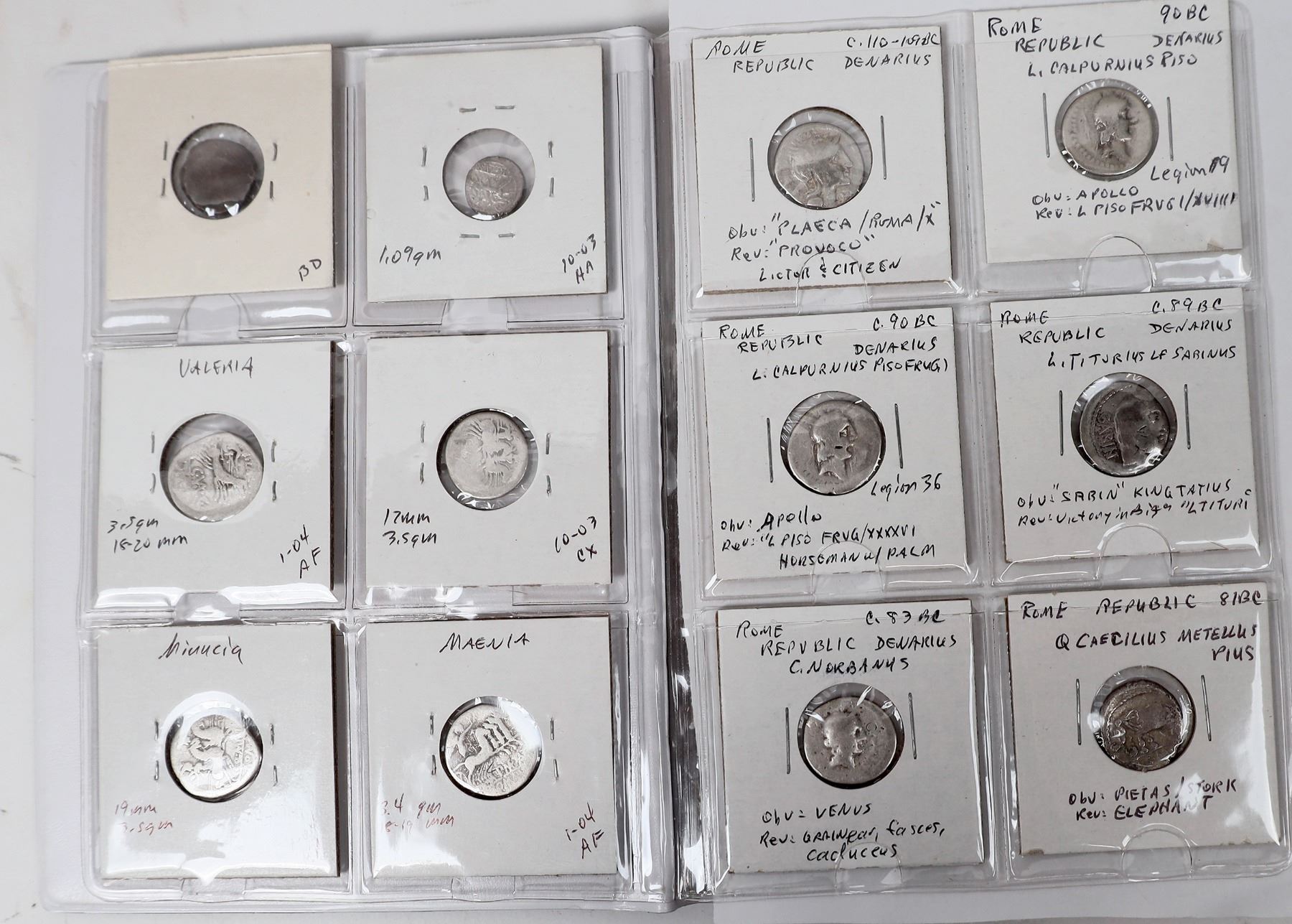 Lot of seventeen Roman Republican coins with denarii, with a silver sestertius, quinarius, and quadrans. Includes coins of Ahenobarbus, Scipio, Cato, Pompey and his son Gnaeus.