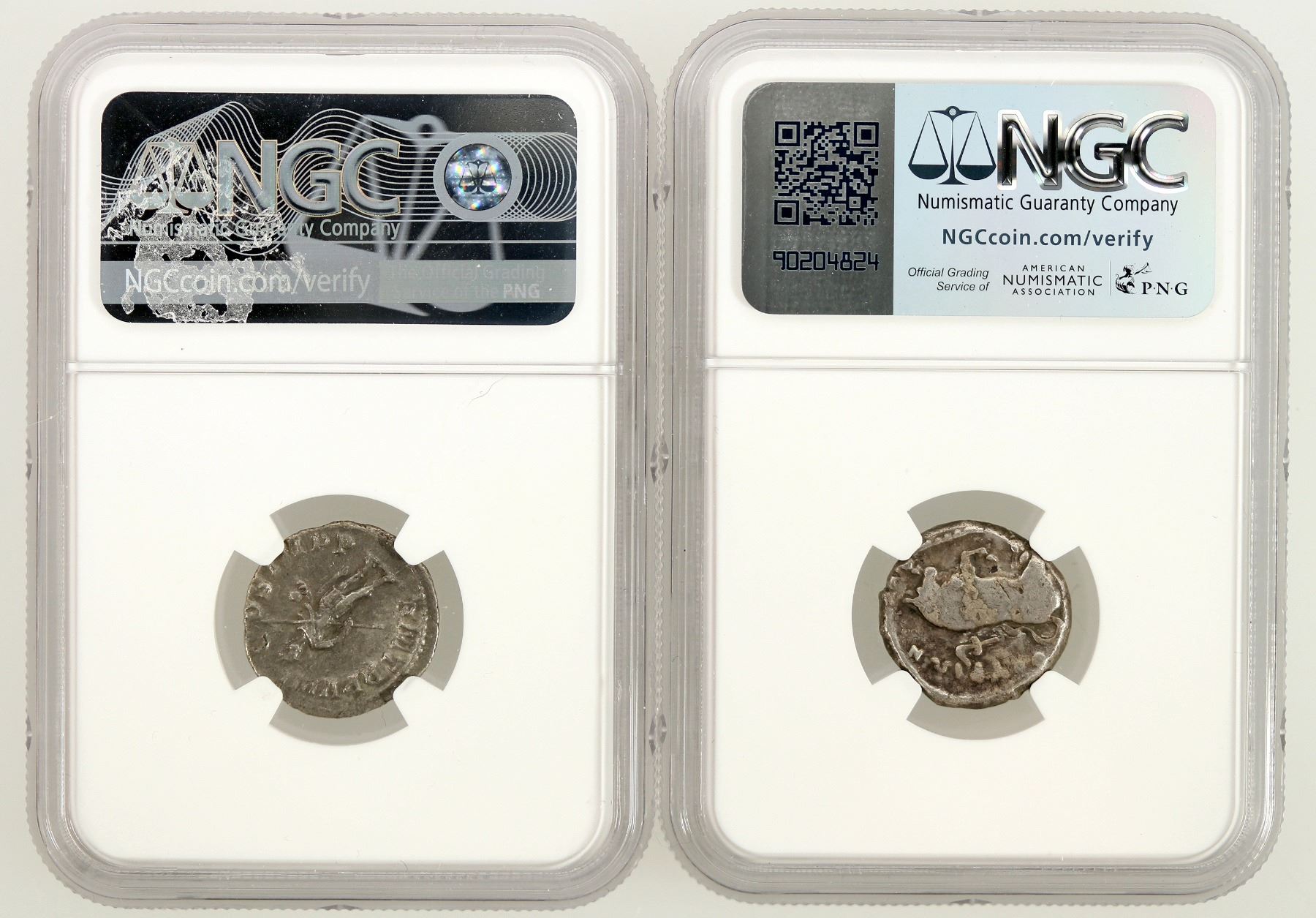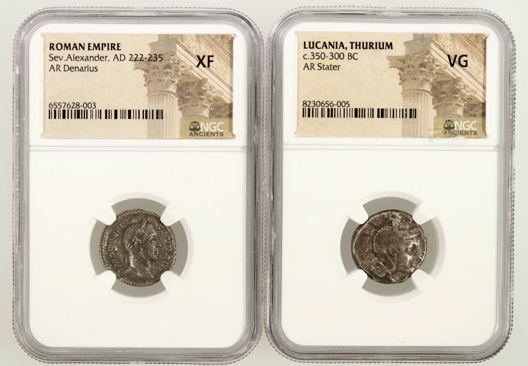 Two NGC graded ancient silver: 1) Lucania, Thurium; c.350-300 BC, AR Stater; graded VG. 2) Roman Empire; Sev. Alexander, AD 222-255; AR Denarius; graded XF.