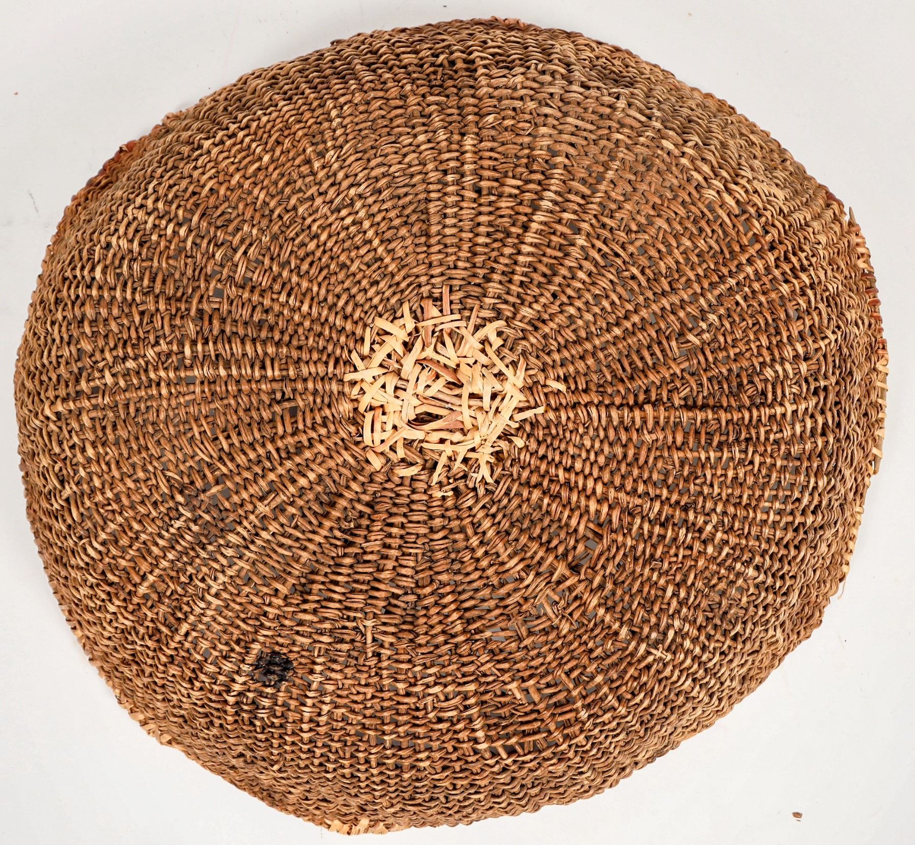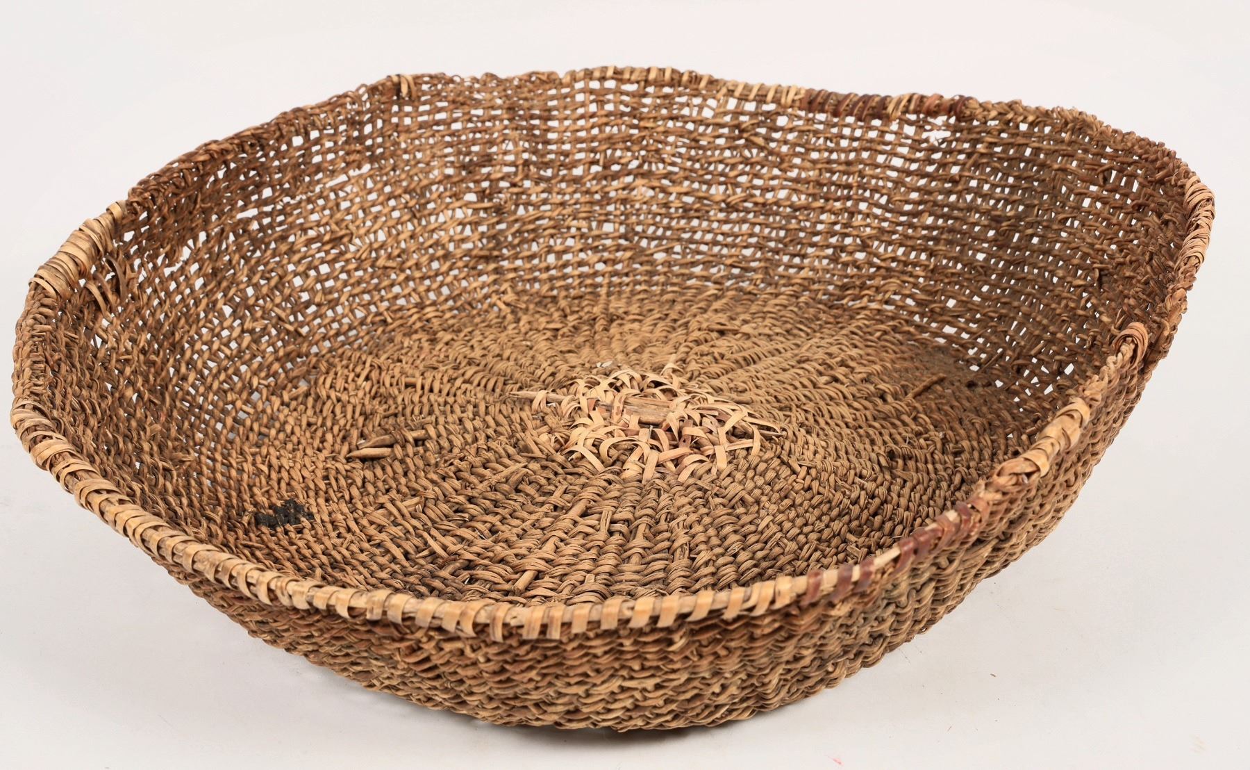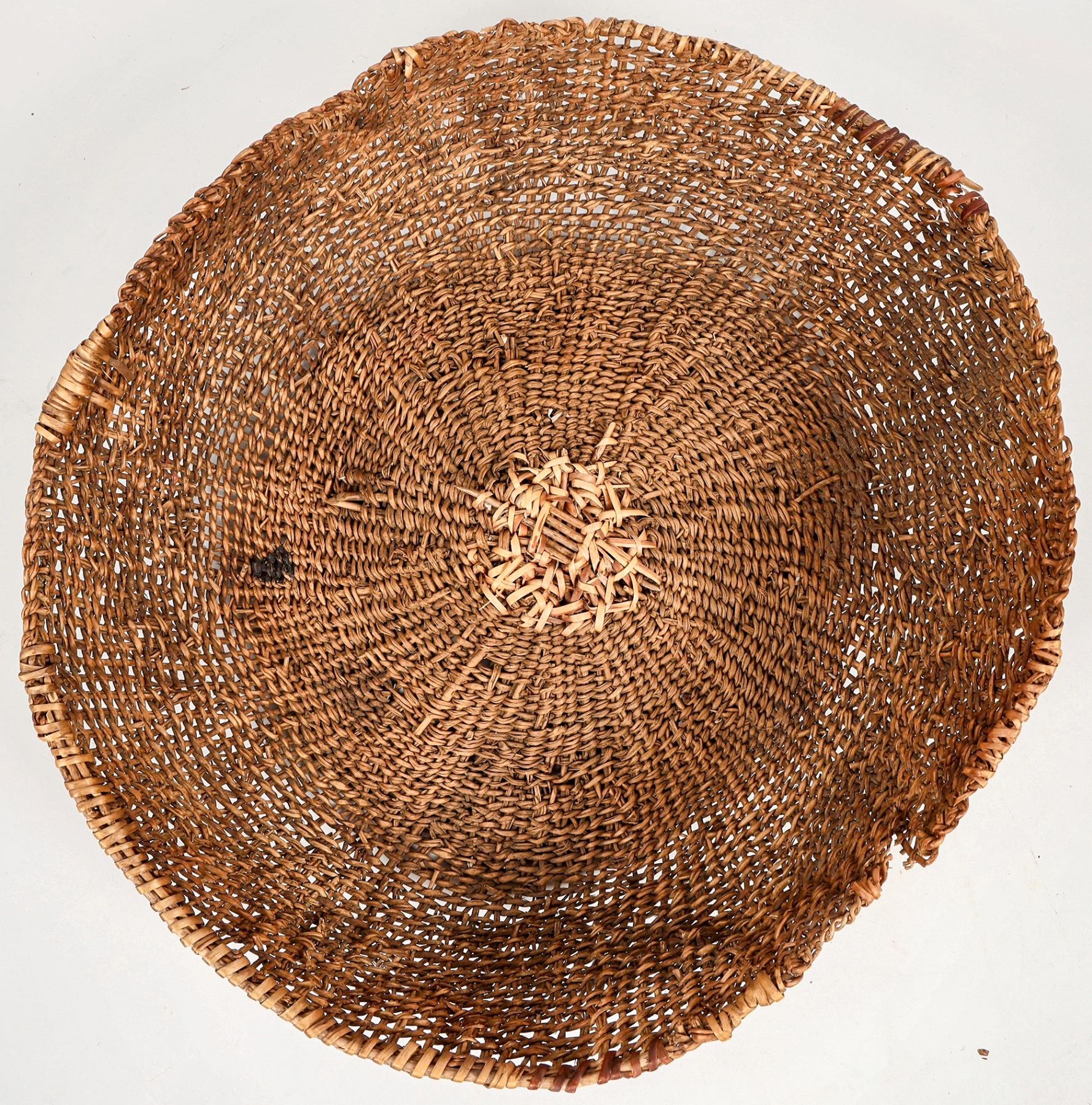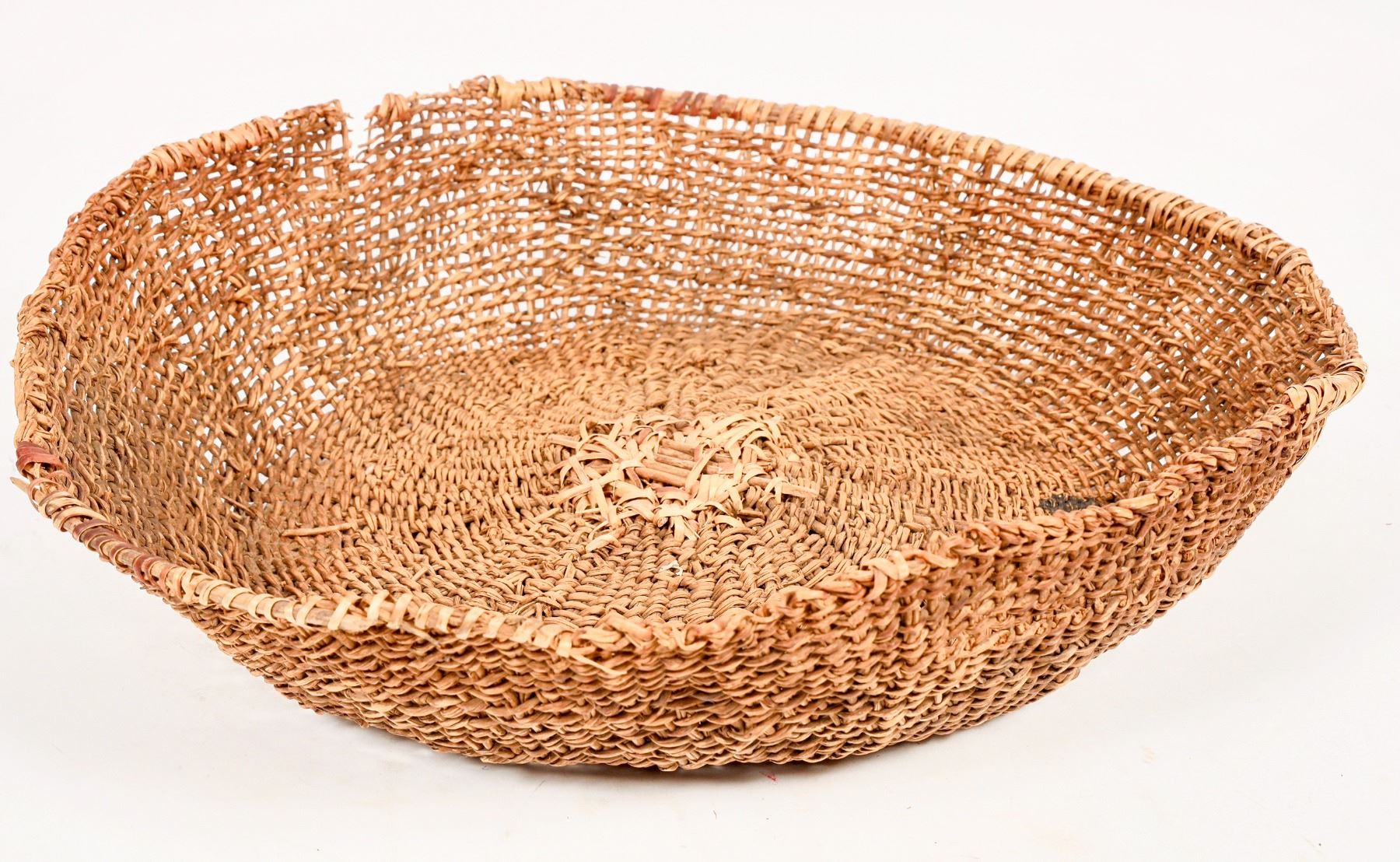 Probable Paiute or Shoshone/Shoshoni woven basket from the Great Basin Area, c1900. This gorgeous and aged basket smells lovely with a mixture of earthy and woody scents. Small areas of damage are present, including a rim break affecting about 5 rows and one column, a gash affecting about 17 columns (~5") opposite the rim break, about 2/3rd of the way up the basket. Mouth diameter measures about 18", height measures about 4", base diameter measures about 13". Please inspect photo.