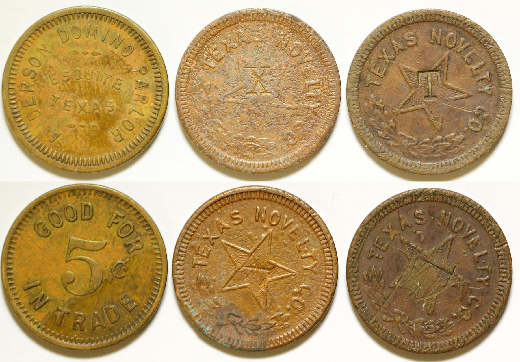 Lot of three. Two from the Texas Novelty Co.Br., rd., 22 mm. Also Anderson Domino Parlor / Mesquite / Texas ; Good for / 5c / In Trade. Br., rd. 21 mm. State: Texas City: Mesquite Date: HWAC# 82463