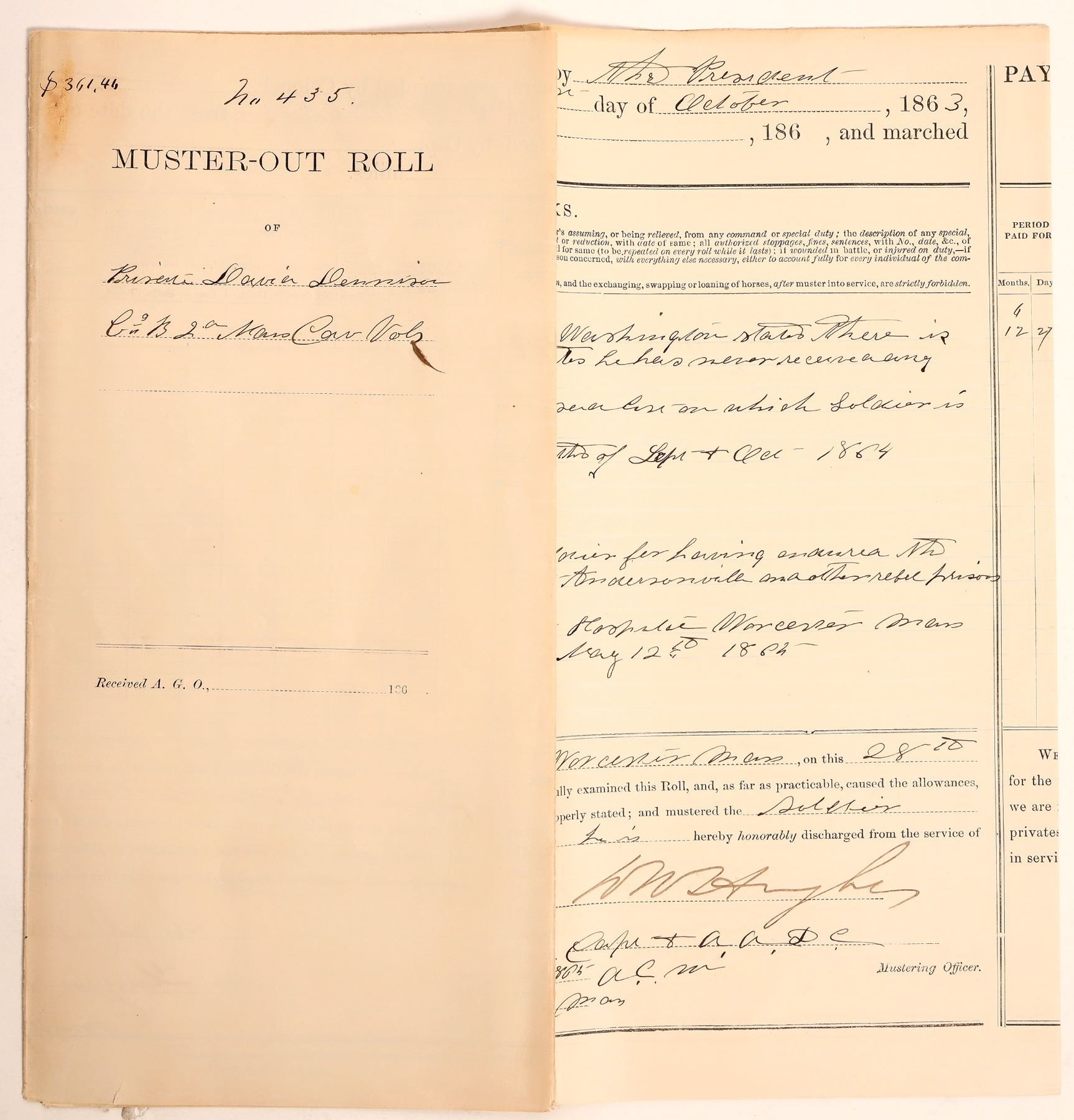 This paper eight page fold-out document is the Muster-Out paper for Private David Dennison of the Massachusetts Cavalry. He completed three years of service with the last three months in Anderson prison for which he received extra pay. Dennison's age is not stated; clearly he was one of the lucky ones to survive that ordeal. 40 in. x 10 in.