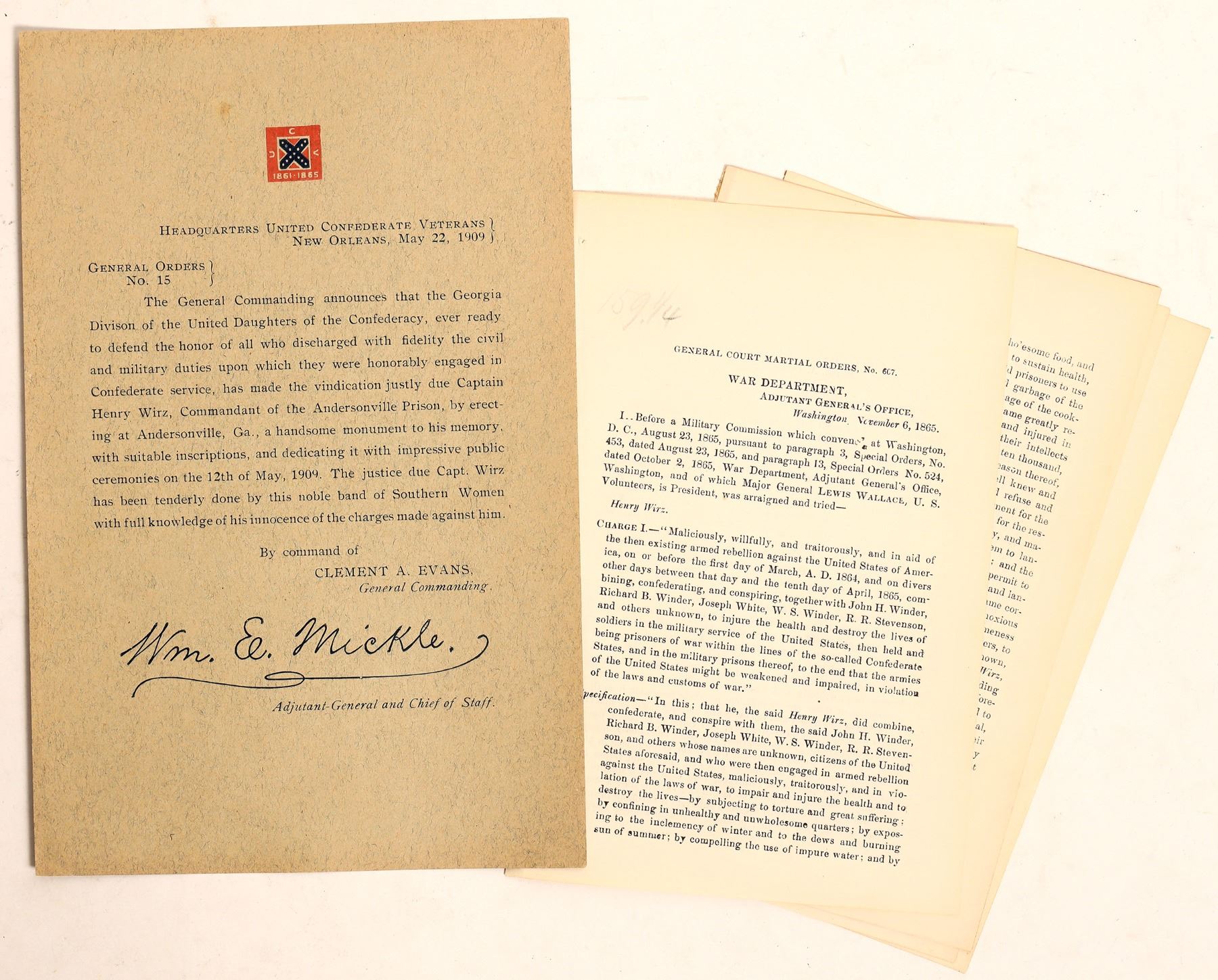 A complete General Court Martial Orders No.607 outlines the "malicious(ly), willful(ly), and traitorous(ly)" crimes committed by Henry Wirz for loss of life while commanding the prison camp at Andersonville , Ga. These orders given by the Executive Mansion of President Andrew Johnson. A loose leaf document with two hole punch and removed from a larger binding. At 4.75 in. X 7 in. A second article was published by the "Headquarters United Confederate Veterans/ New Orleans, May 22, 1909, General Orders No. 15". This single page document outlines the erection of a monument for Henry Wirz at Andersonville, Ga. by the Daughters of he Confederacy. It is a vindication justly due Henry Wirz for his actions at the Andersonville prison while under his command according a "band of Southern Women". It would appear to some, that the charges against Henry Wirz were unjustified. A fine document without folds or tears. 5.5 in. X 8.75.