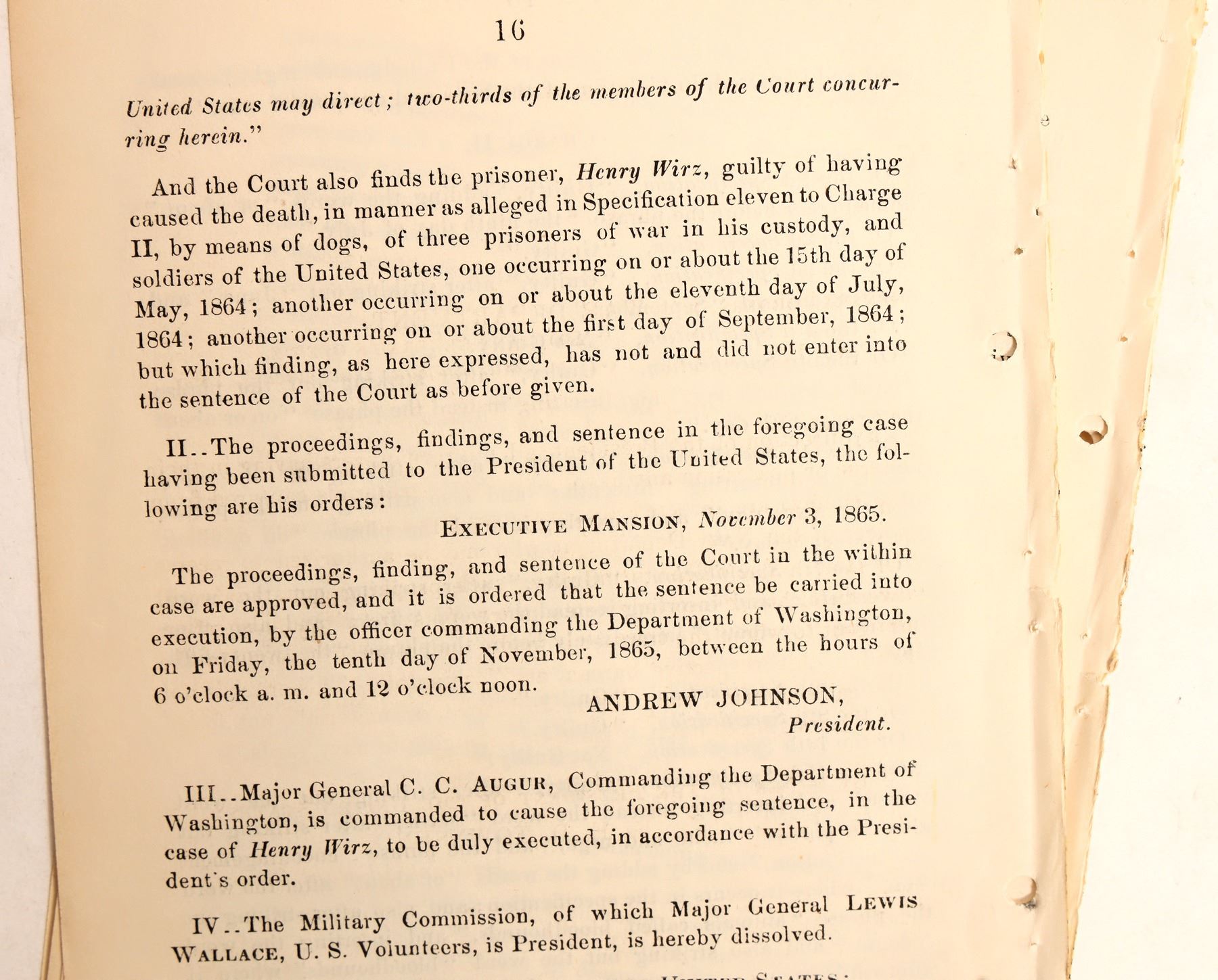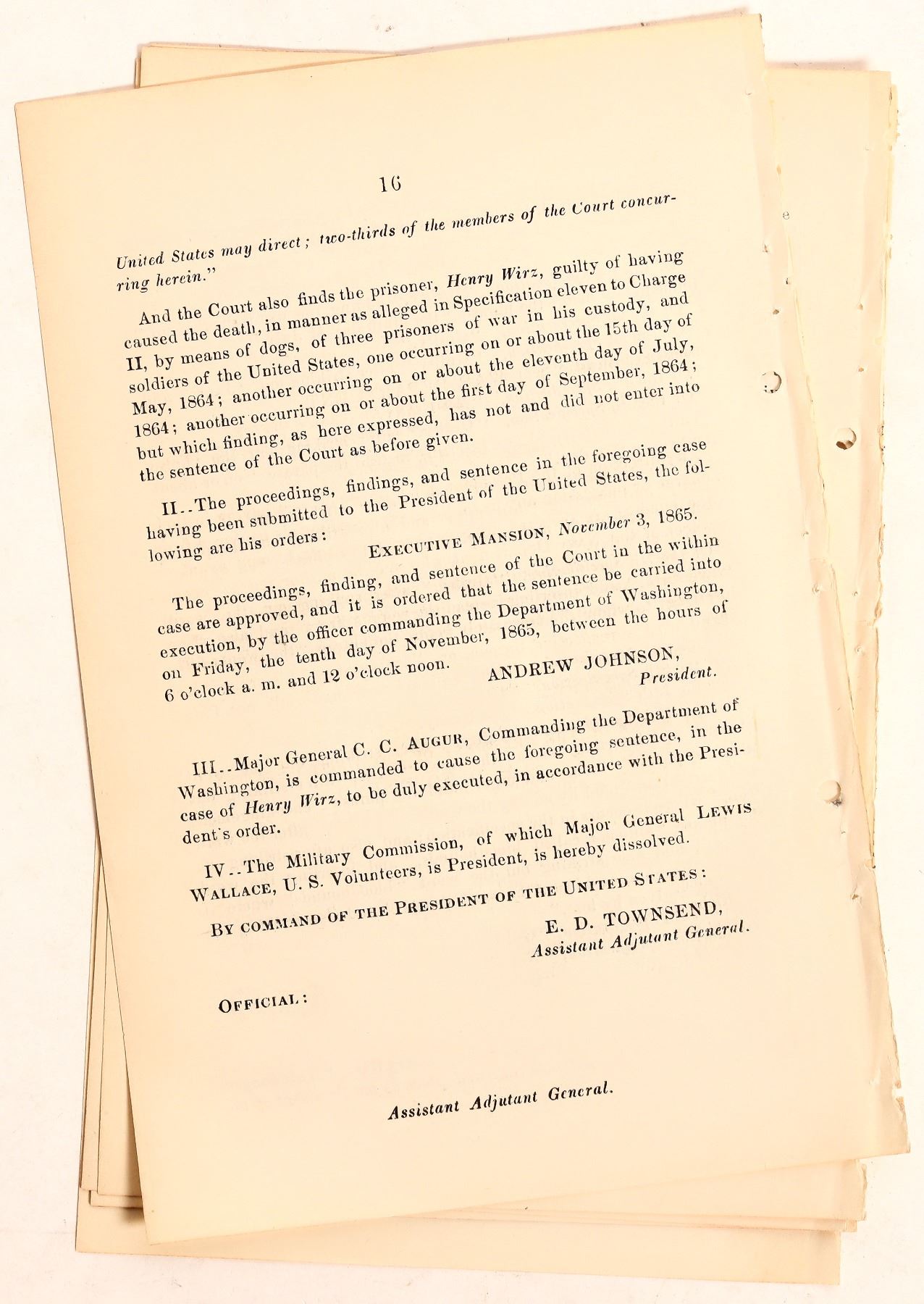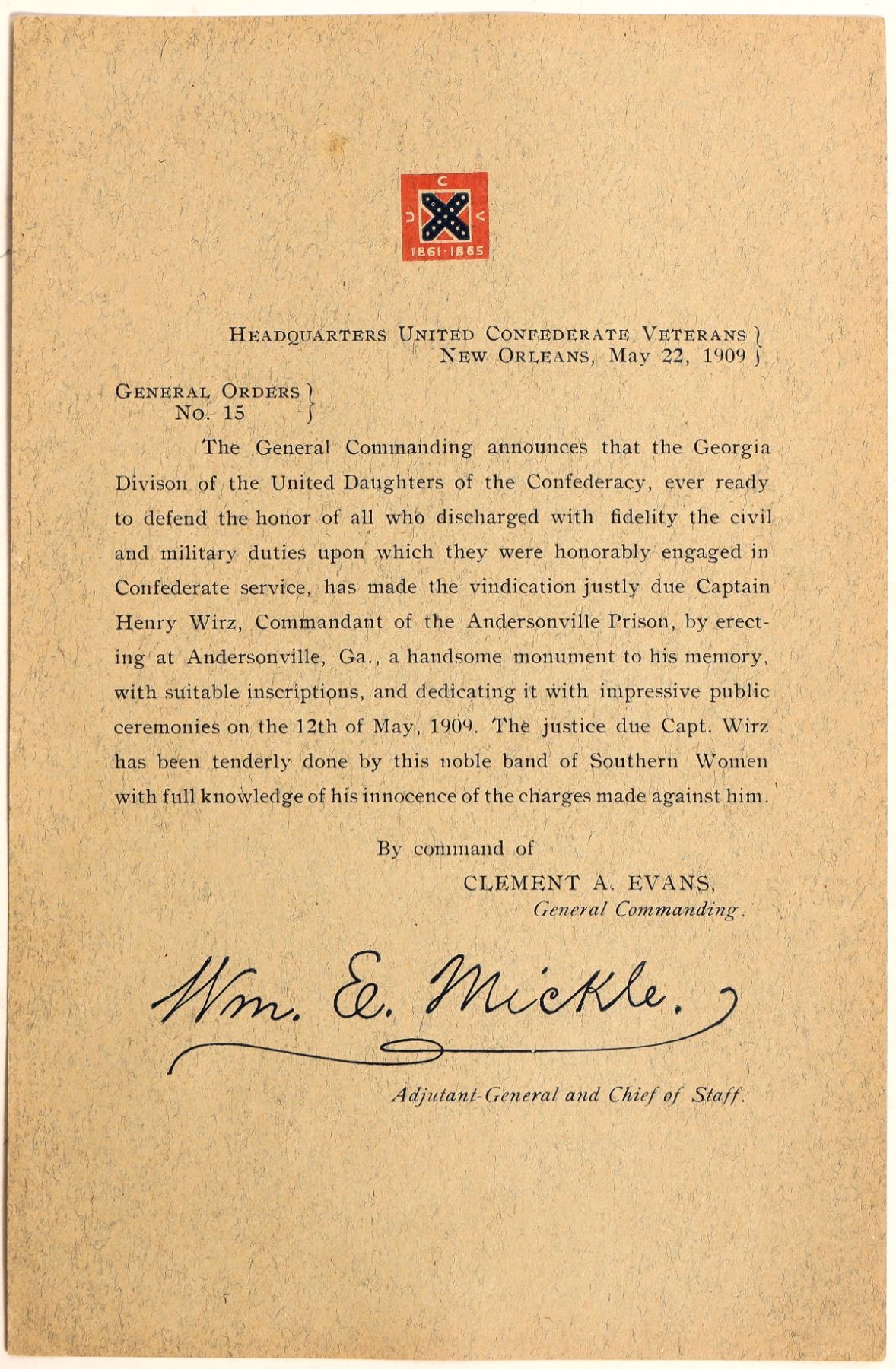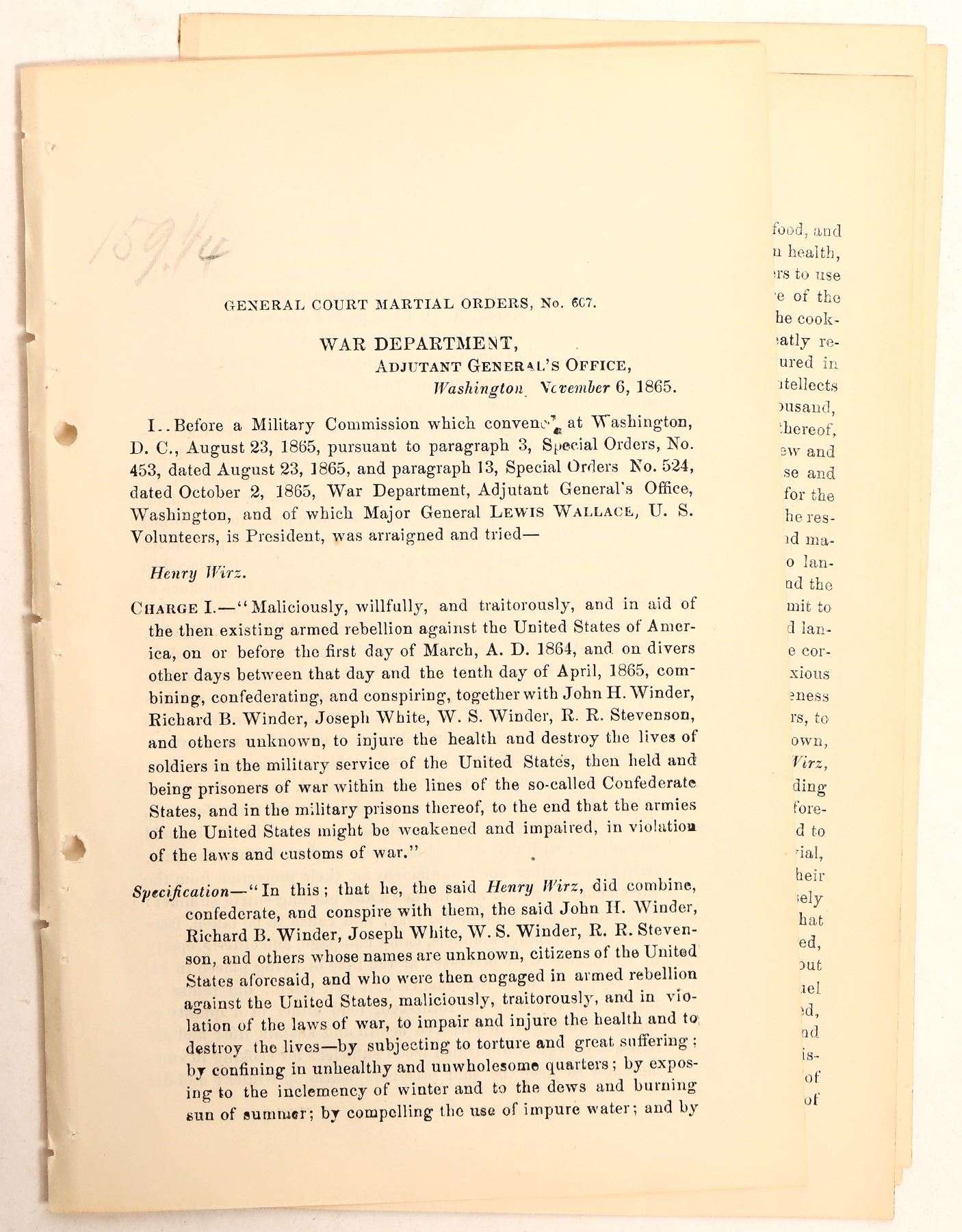 A complete General Court Martial Orders No.607 outlines the "malicious(ly), willful(ly), and traitorous(ly)" crimes committed by Henry Wirz for loss of life while commanding the prison camp at Andersonville , Ga. These orders given by the Executive Mansion of President Andrew Johnson. A loose leaf document with two hole punch and removed from a larger binding. At 4.75 in. X 7 in. A second article was published by the "Headquarters United Confederate Veterans/ New Orleans, May 22, 1909, General Orders No. 15". This single page document outlines the erection of a monument for Henry Wirz at Andersonville, Ga. by the Daughters of he Confederacy. It is a vindication justly due Henry Wirz for his actions at the Andersonville prison while under his command according a "band of Southern Women". It would appear to some, that the charges against Henry Wirz were unjustified. A fine document without folds or tears. 5.5 in. X 8.75.