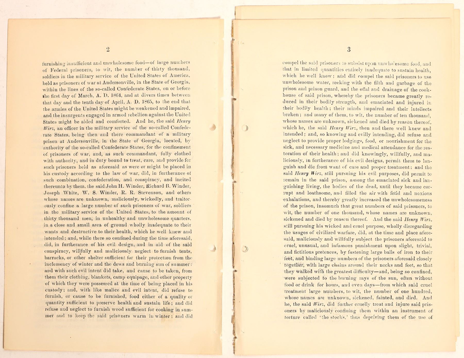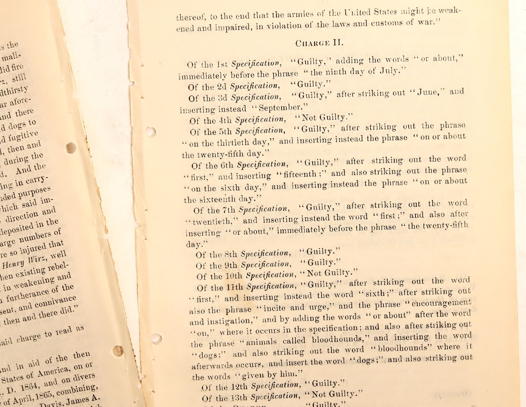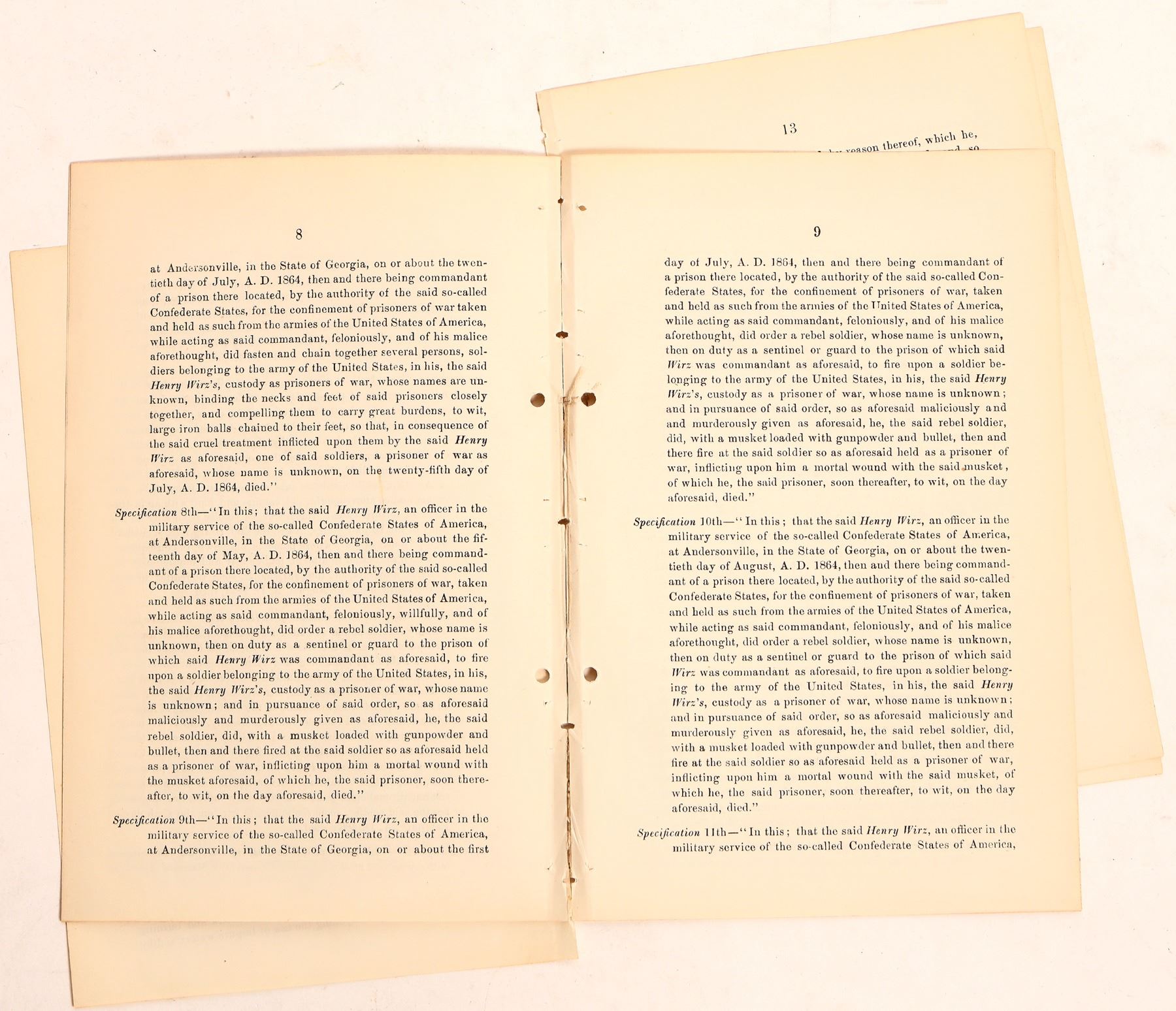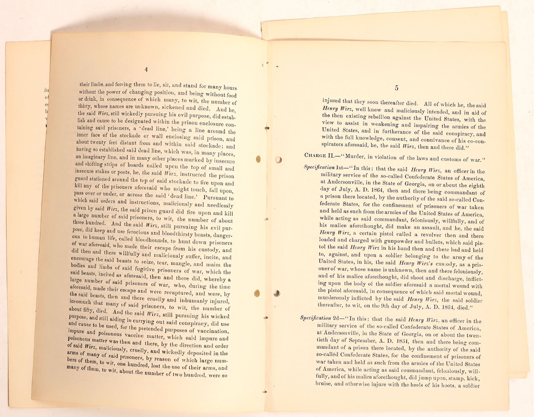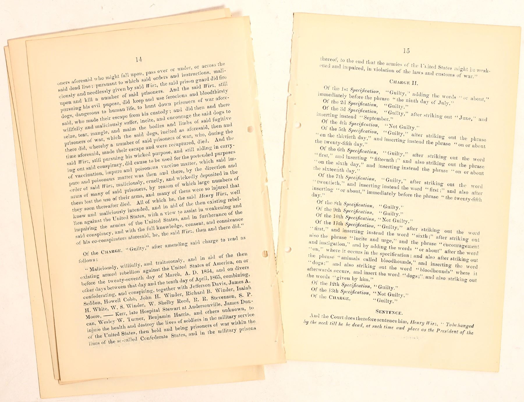 A complete General Court Martial Orders No.607 outlines the "malicious(ly), willful(ly), and traitorous(ly)" crimes committed by Henry Wirz for loss of life while commanding the prison camp at Andersonville , Ga. These orders given by the Executive Mansion of President Andrew Johnson. A loose leaf document with two hole punch and removed from a larger binding. At 4.75 in. X 7 in. A second article was published by the "Headquarters United Confederate Veterans/ New Orleans, May 22, 1909, General Orders No. 15". This single page document outlines the erection of a monument for Henry Wirz at Andersonville, Ga. by the Daughters of he Confederacy. It is a vindication justly due Henry Wirz for his actions at the Andersonville prison while under his command according a "band of Southern Women". It would appear to some, that the charges against Henry Wirz were unjustified. A fine document without folds or tears. 5.5 in. X 8.75.