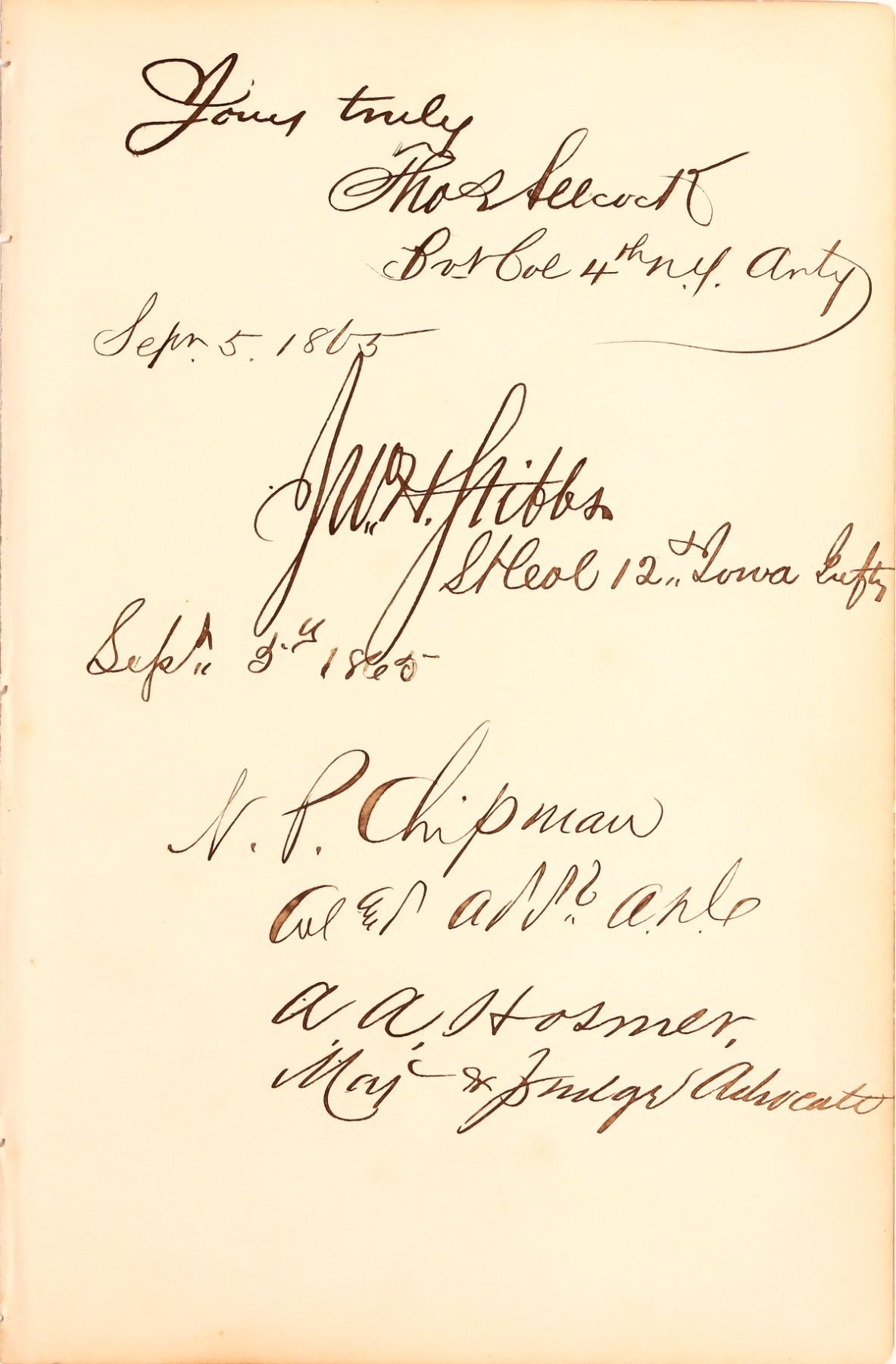 This document has four signatures from the prosecution team convicting Major Henry Wirz of war crimes. There is Norton Parker Chipman (third signature) a Union officer with a law degree and leading military prosecutor. Thomas Allcock (first signature) a Brevet Colonel on the 4th New York Artillery also on the prosecution team. John H. Stibbs (second signature) from the 12th Iowa Infantry. A.A. Hosmer (fourth signature) a practiced layer was Judge Advocate at the trail. Clear signatures. 4.75 in. X 7 in. yellowed edges. These men were picked because of their education, legal experience, and leadership skills.