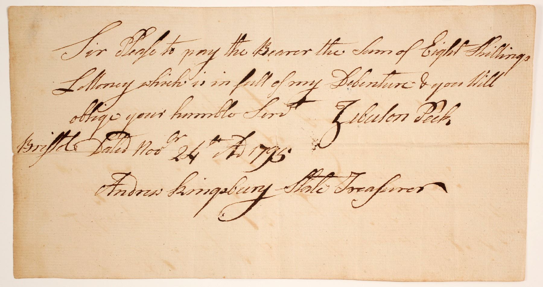 1795 debenture document to Zebulon Peck signed by Andrew Kingsbury, CT State Treasurer. 4.25x7.75"