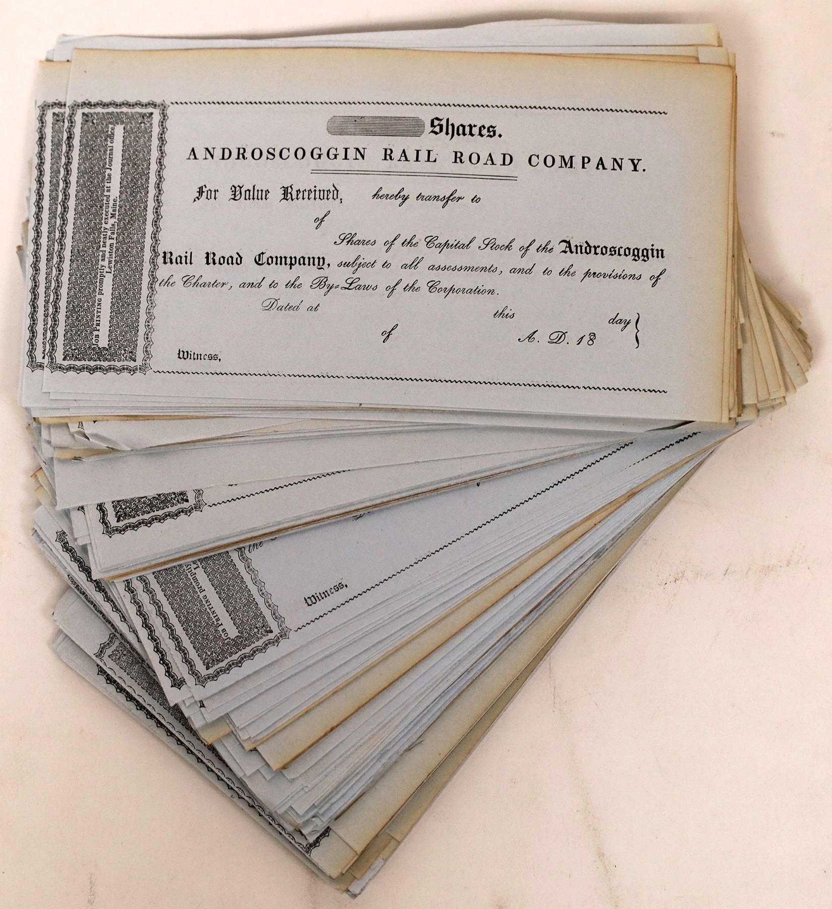 Lot of approx. 200 unissued stock certificates, c.1840s-50s. 4.25 x 7.5" Black print on light blue paper. An act was introduced to establish this railroad in 1848.