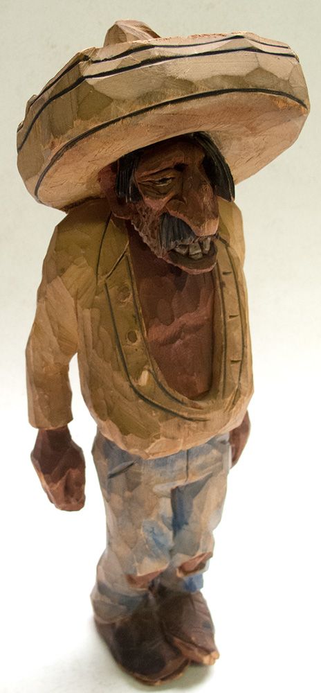 Andy Anderson, woodcarver, (1893–August 20, 1960) was one of the recognized masters of 20th century woodcarving, most famous for Scandinavian flat-plane style of woodcarving and caricature carving. This carving is of a man in a sombrero, holes at his knees and elbows. Signed 'Andy' at back of shirt.City: County: State: Date: