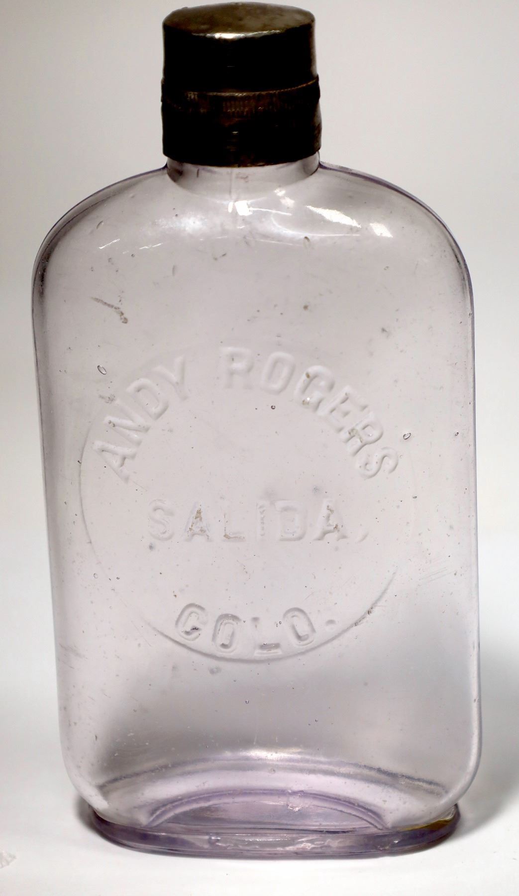 Preble W-134. Andy Rogers / Salida, / Colo. Pocket flask, light purple, 5.5", ground top, with metal cap. Haziness, scratches, chip on front base, chip on lip. Please inspect.