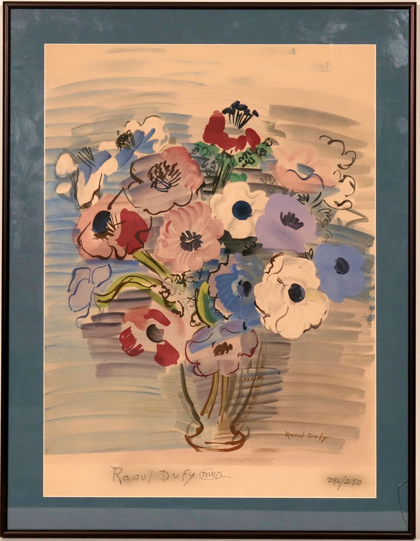 Original lithograph by Raoul Dufy (1877-1953), numbered and signed. 242/250. Unfortunately, original owner went over Dufy's writing with an ink pen, undermining its value. Print: 20.5" x 16.5", framed: 26.75" x 20.75". Dufy's cheerful work mostly depicts events of the time period, including yachting scenes, sparkling views of the French Riviera, chic parties and musical events. The optimistic, fashionably decorative, elegant and illustrative nature of much of his work was at first less highly valued critically than the works of artists who have addressed over time, collectors and critics came to greatly appreciate his particularly distinctive approach.