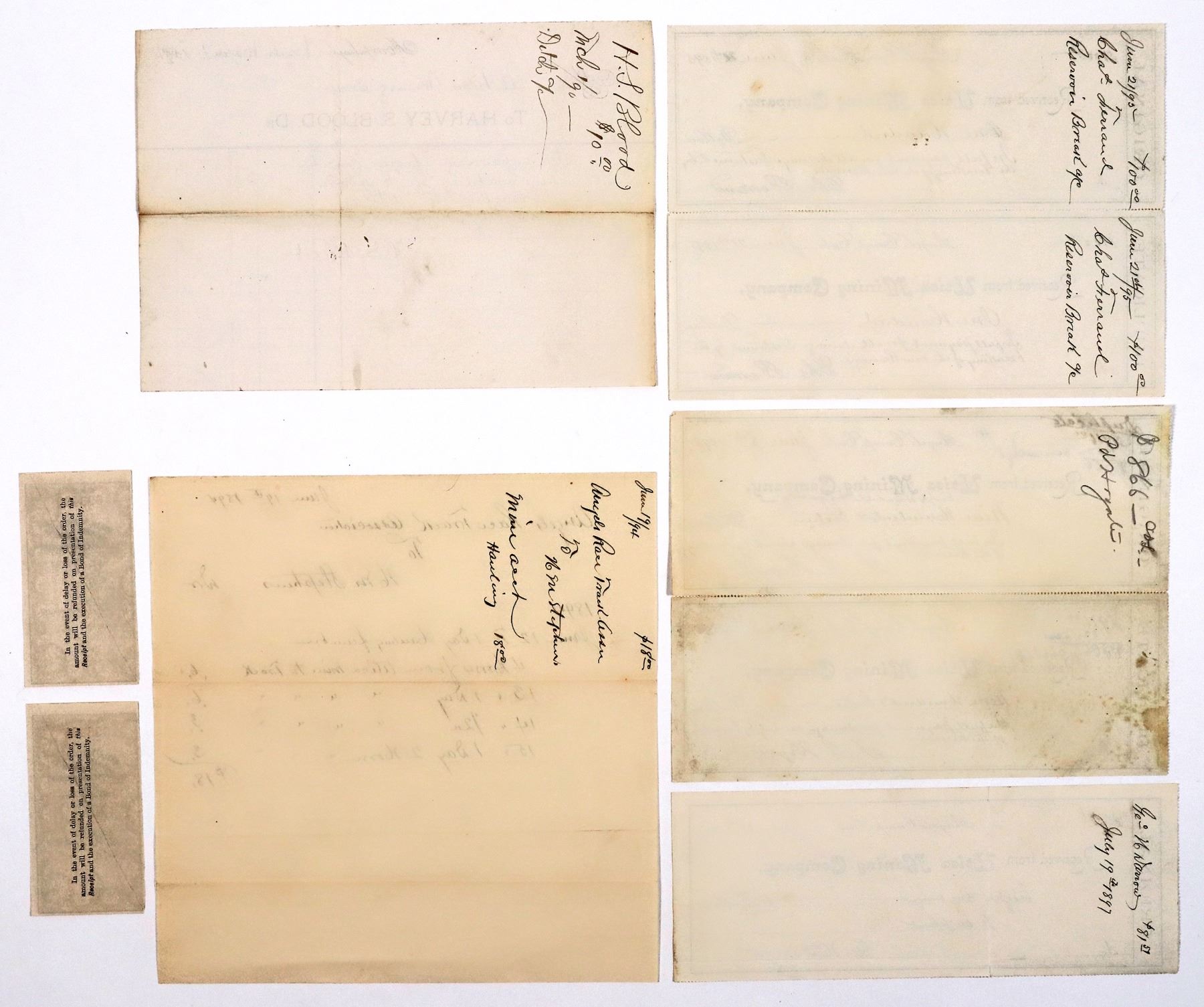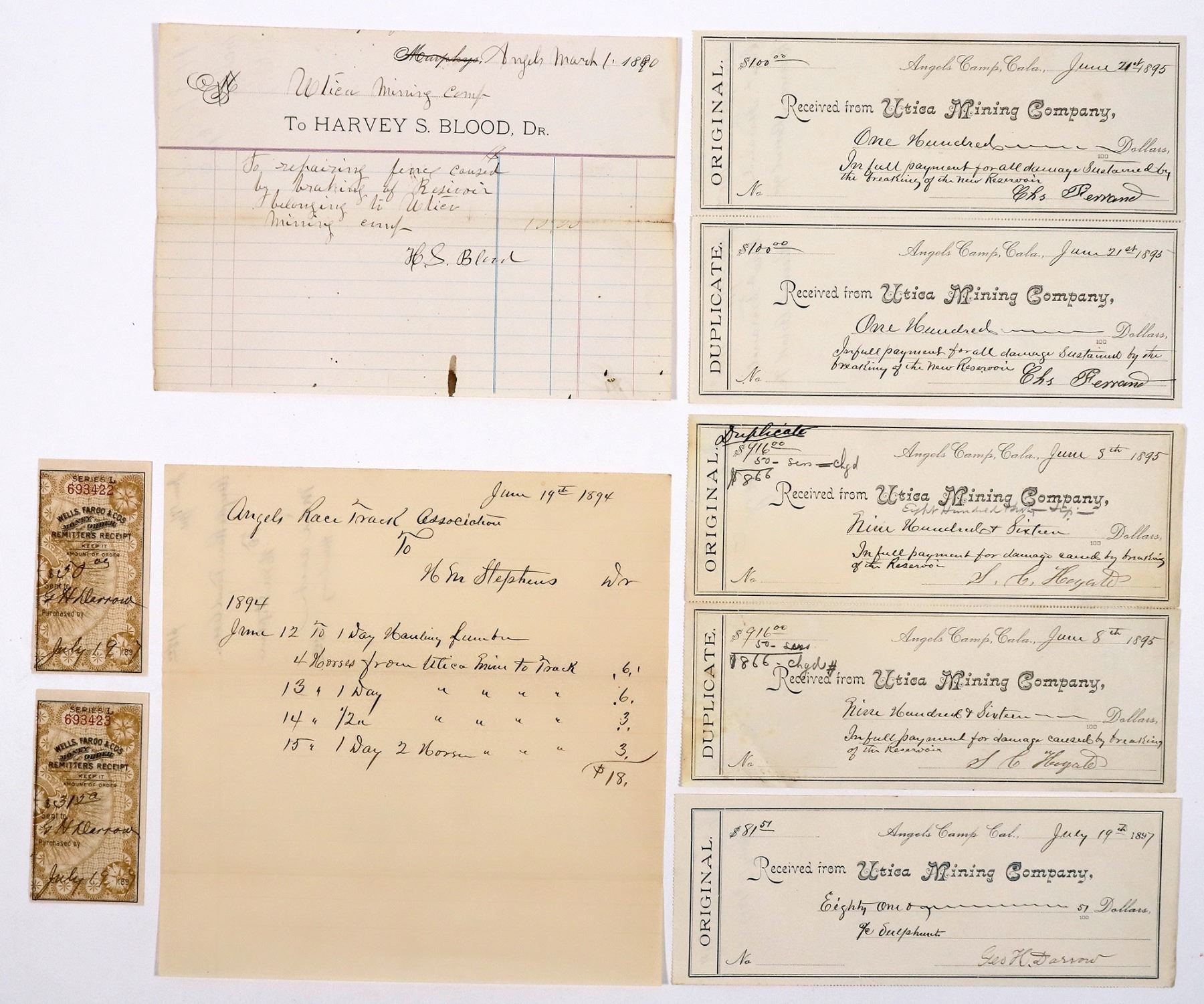 7 pieces of Angel's Camp ephemera. 1894 Angels Race Track(horse racing) letterhead regarding damage caused by the breaking of a reservoir. 5x c. 1895 Utica Mining checks. 1890 Utica Mining billhead to Harvey S Blood Dr. for repairing fence caused by braking(sic) of resivior(sic) belonging to Utica Mining.