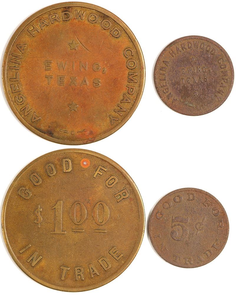 1) Round brass 21mm ANGELINA HARDWOOD COMPANY / EWING, TEXAS // GF / 5C / IT. 2) Round brass 38 mm ANGELINA HARDWOOD COMPANY / EWING, TEXAS // GF / $1oo / IT. 2 token town. HWAC# 62305 Date: Location: Ewing, Texas