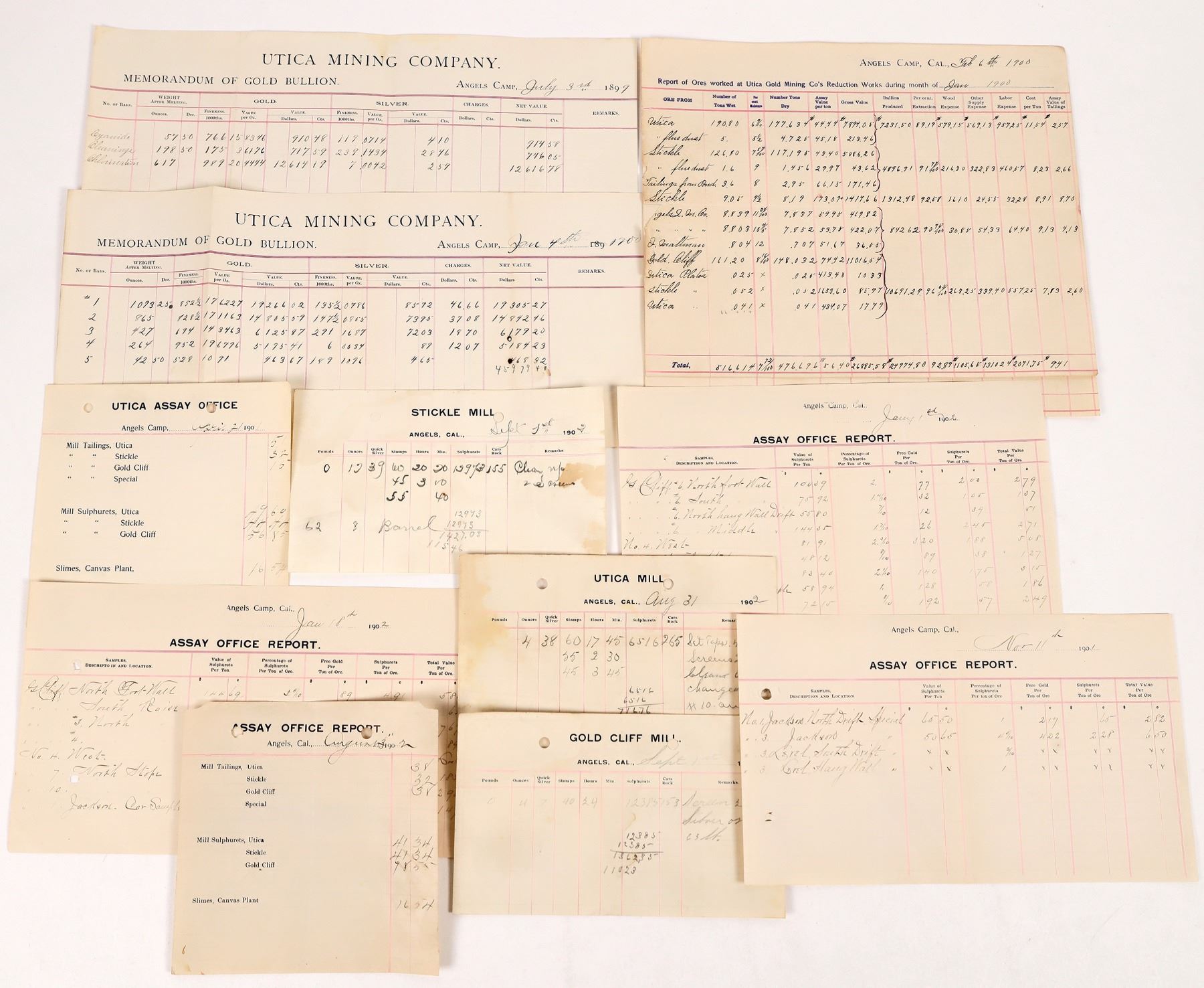 Lot of 12. All appear to be from the Utica Mining Company. Includes: 1-2) Two memorandums of gold bullion, 1899 and 1900. 3) Smaller 1901 receipt for mill tailings and mill sulpherets and slimes. 4-5) Two Report of Ores worked at the Utica Reduction Works. One from 1900 and the other unused. 6-9) Four Assay Office Reports, 1900-1902. 10-12) Three smaller assay forms for three different mills: Stickle Mill, Gold Cliff Mill, and Utica Mill, 1902. The Utica Mine is one on the best-known gold mines in the Mother Lode, and is the consolidation of the Brown, Confidence, Dead Horse, Jackson, Little Nugget, Raspberry, Stickle, Utica, and Washington claims. The surface of the Utica claim was mined during the early part of the gold rush, but large-scale development was only conducted between 1893 and 1915 by the Utica Gold Mining Company. During the 1890s, the Utica Mine was one of the most productive in the nation. Angels Camp California Franklin Collection