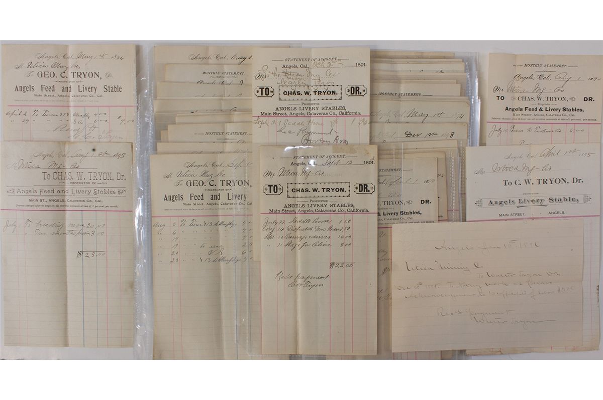 40 pieces. 5 different billheads. And just what would a mine want from a livery stable? Rent-a-horse, use of a stage, breeding a mare, taking a team to Tuolumne County, surrey to Valley Springs, buckboard for two days, etc.City: Angels CampCounty: CalaverasState: CADate: