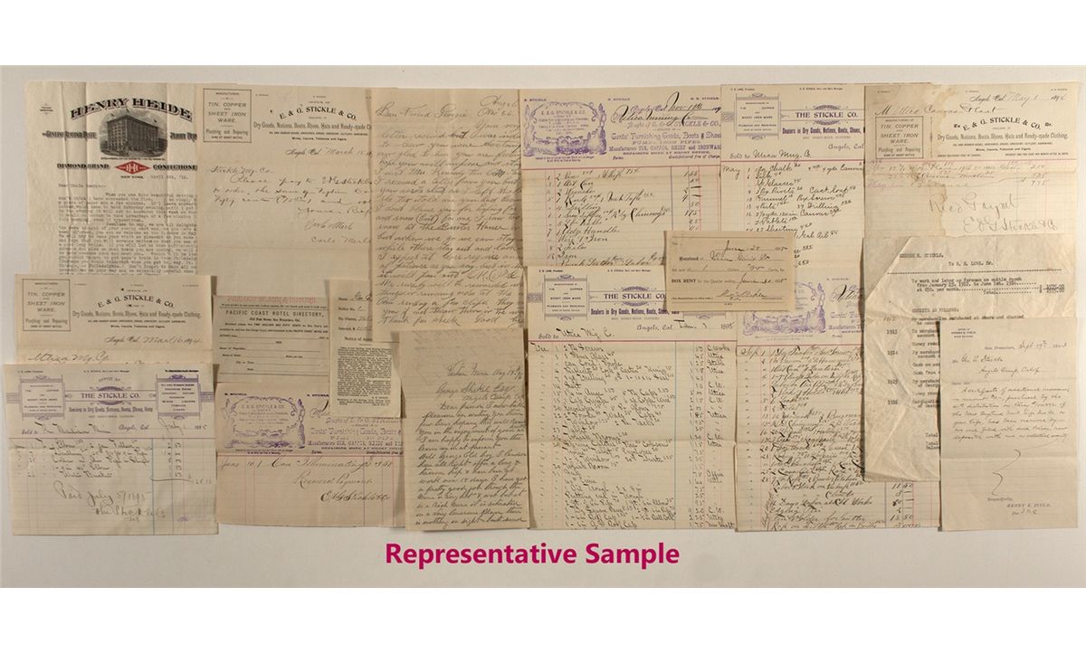 Around 350 pieces. Includes various billheads, letters, and notes. This is not only a look into a company, but there are personal insights also. Please inspect in person to see the content and magnitude of this collection.City: Angels CampCounty: CalaverasState: CADate: