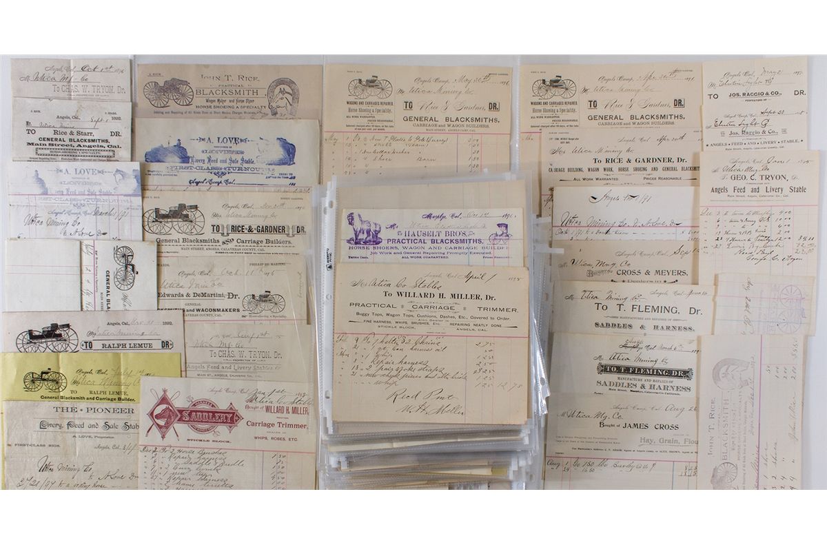 200+ pieces. Over 25 different billheads. Hauselt Brothers, John T. Rice, Rice & Gardner, Robert Gardner, Rice & Starr, The Pioneer, Ralph Lemure, A. Love, Willard H. Miller, W. H. Willard, James Cross, T. Fleming, Charles W. Tyron, George C. Tyron, Joseph Raggio & Company, Cross & Meyers, and Edwards & DeMartini are all represented. Includes dealings with the local mines and businesses.City: Angels CampCounty: CalaverasState: CADate: