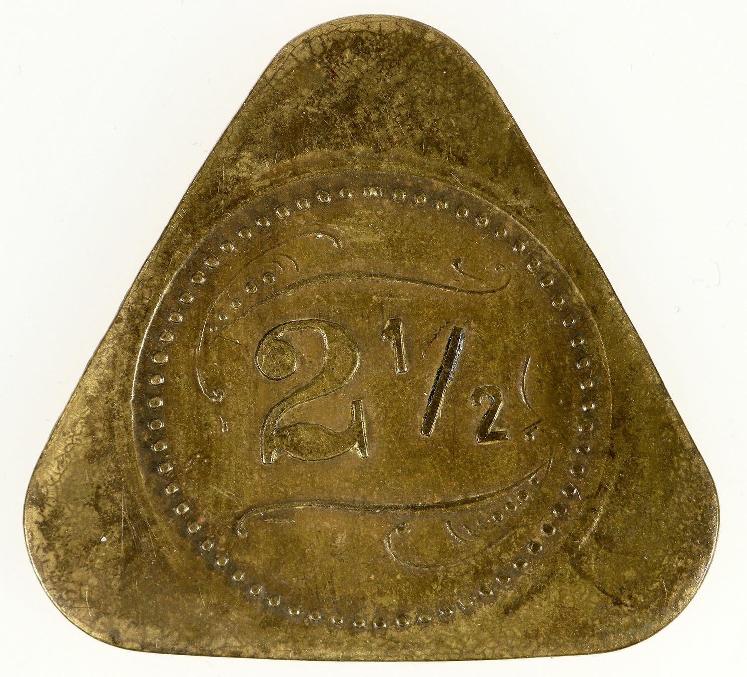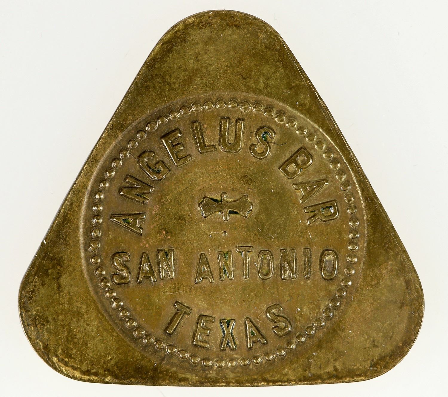 There are four varieties of this triangular 2 1/2 cent token in the tokencatalog.com and this one is different. ANGELUS BAR / SAN ANTONIO, / TEXAS. // GOOD FOR / 2Ω¢ / IN TRADE; Br., tri., 31 mm. The Angelus Bar was associated with the Angelus Hotel, W. S. Franks, Manager "Angelus Bar" at 102 S. Alamo 1909 City Directory. (tokencatalog.com)