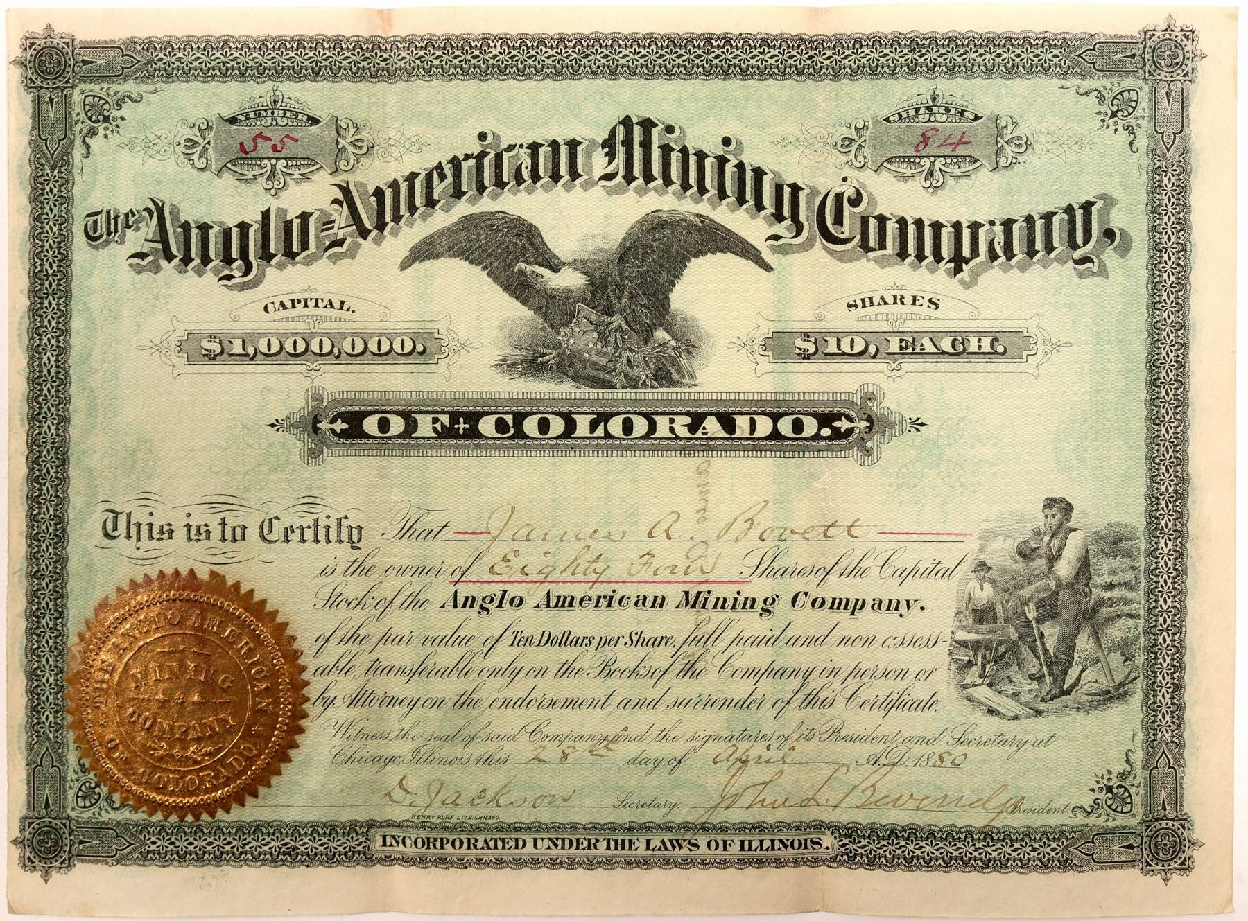 I/U #55 James Bovett 84 shares 1880. Silver mine. Vignette of 2 miners, one resting while the other one pushes a wheel barrel