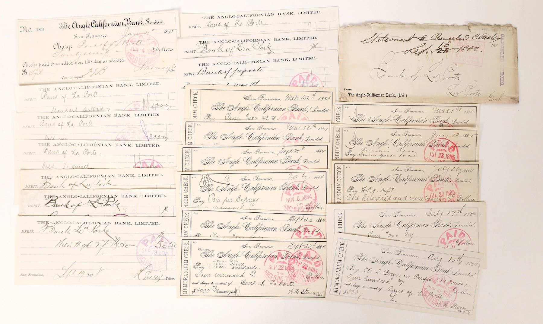 12 c. 1882-85 Anglo Californian Bank, in conjunction with Bank of La Porte, checks and 1 original cover. La Porte was a California Gold Rush camp. California La Porte