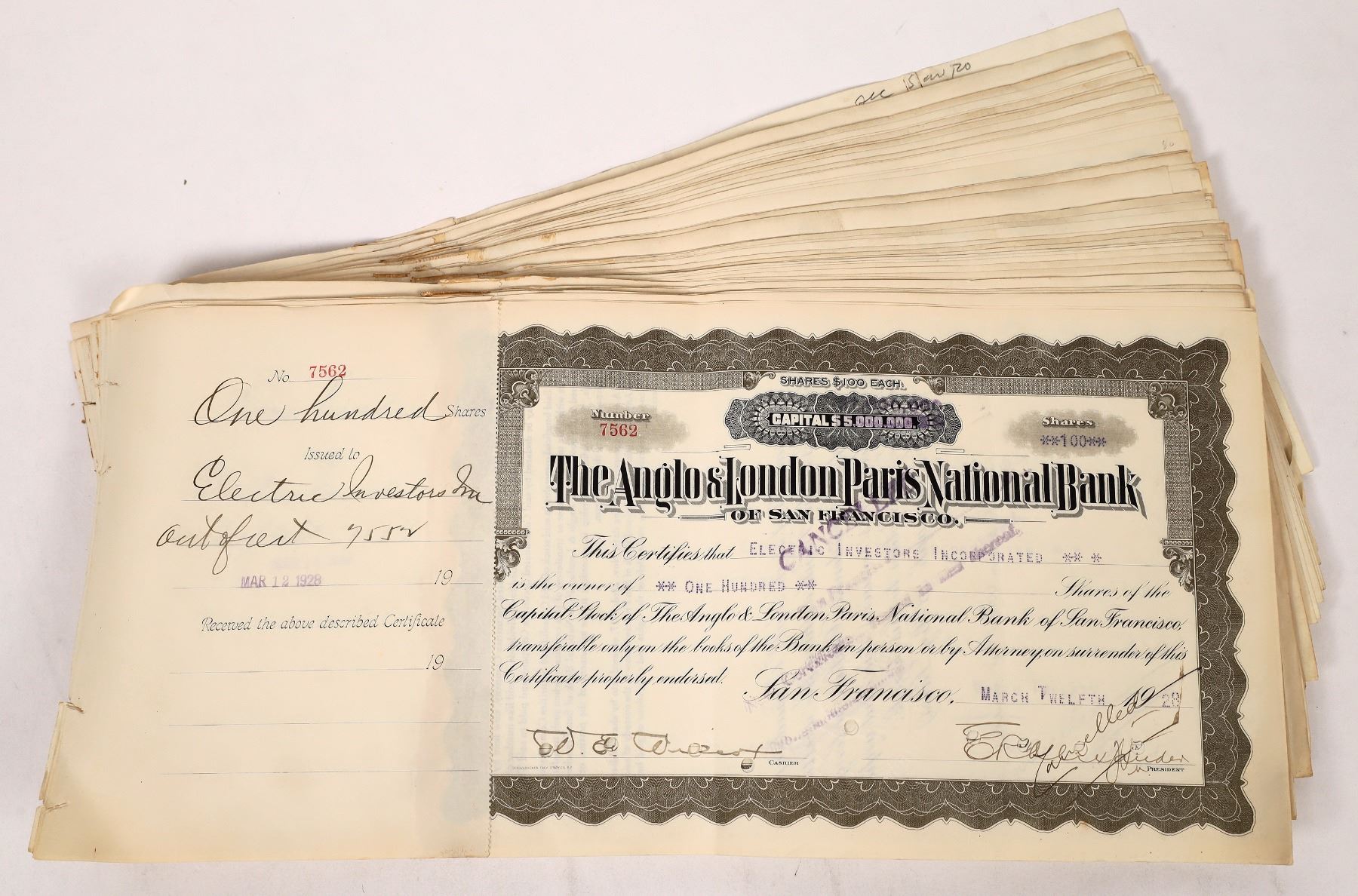About 65 Anglo & London Paris National Bank of San Francisco issued stocks. c. 1928.
