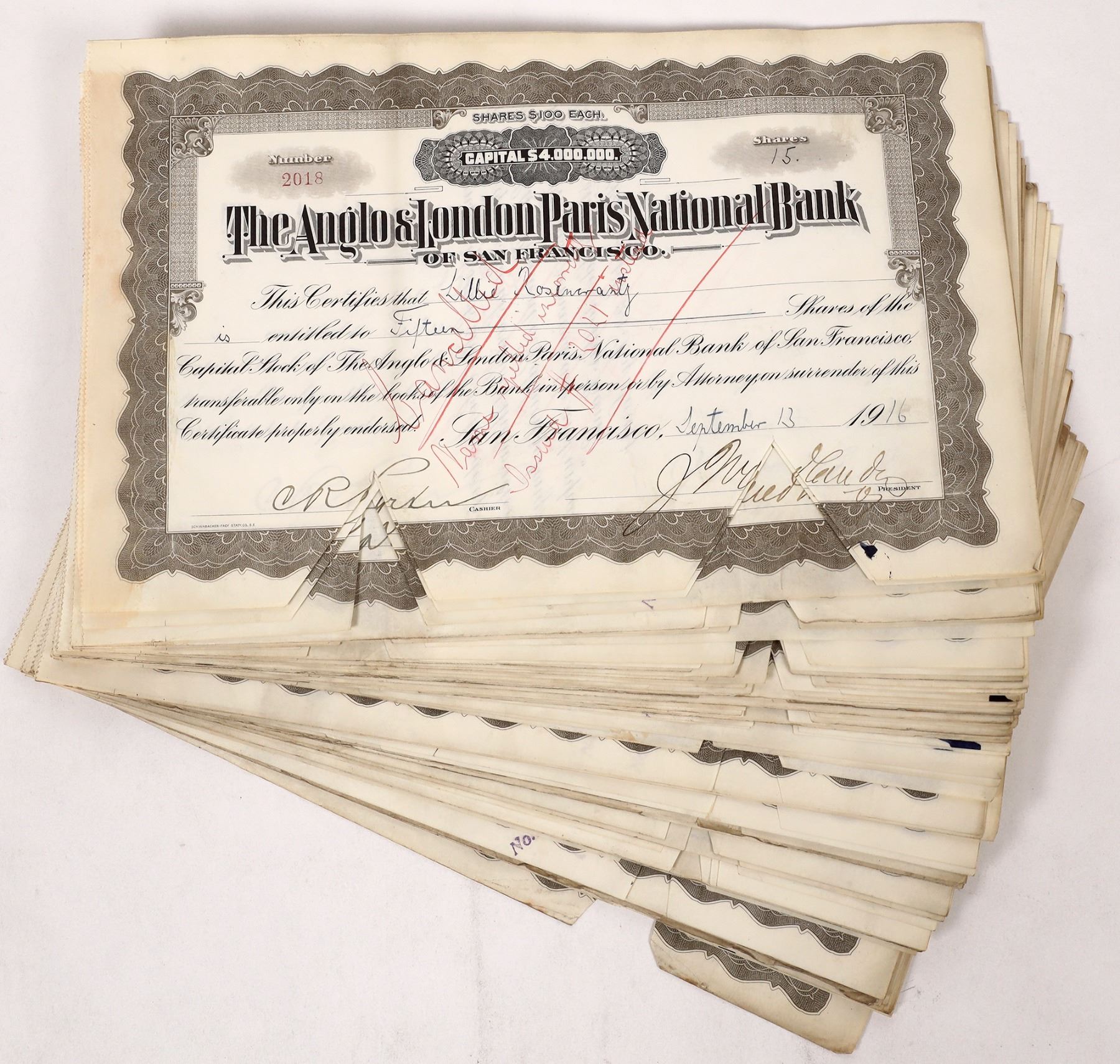 About 65 Anglo & London Paris National Bank of San Francisco issued stocks. c. 1916-17.