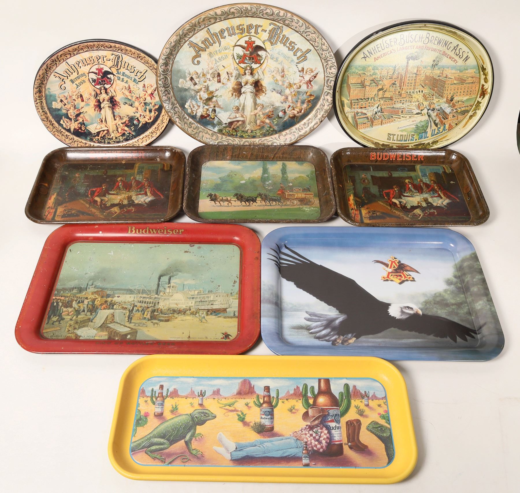Anheuser Busch beer 15 tray collection. 6 original-rectangular 1914 Budweiser, King of Beers boat scene, 12.75x17.5", some rust and scratches. Bevo, about 9x13". Oval Anheuser Busch with cherubs, 13.5x16.5", light scratches. Round white metal Anheuser Busch Gold Classic, Silverado, Pro Am 1977, 12". 2x Rectangular with dog, 10.25x13", edge wear. The rest are reproductions or commemoratives-4 oval about 12x15", 5 rectangular about 12x14". Please inspect.