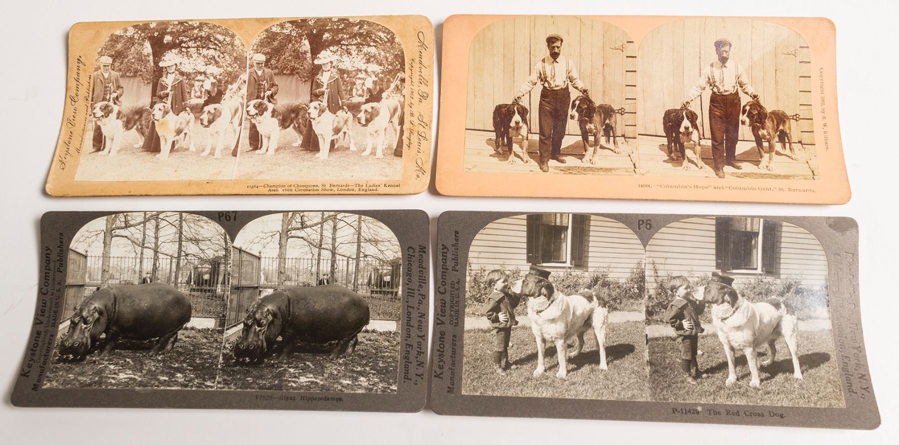 Lot of 4 different stereoviews showing pets or animals. Three show Saint Bernard dogs: Kilburn 14684, c.1902; Keystone 11364 Ladies Kennel Association Show, London; Keystone P-11429 The Red Cross Dog; and Keystone V7826 Giant Hippopotamus. (Prag Collection) Date: Location: United States HWAC # 54705