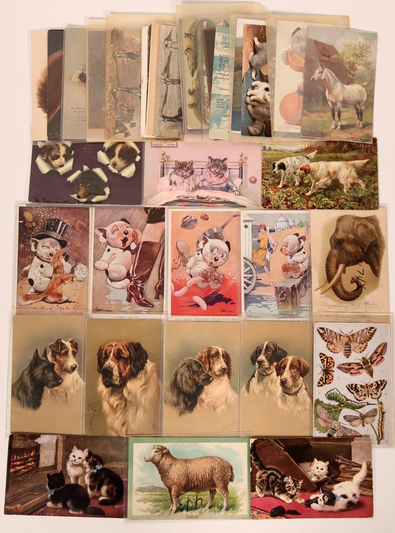 Includes twelve Tuck postcards, with a variety of animals. Large lot of animal postcards featuring dogs, cats, horses, and various other creatures by other artists. Also, includes four cards from Valentine's Bonzo series (Valentine & Sons Ltd., London. See photos.