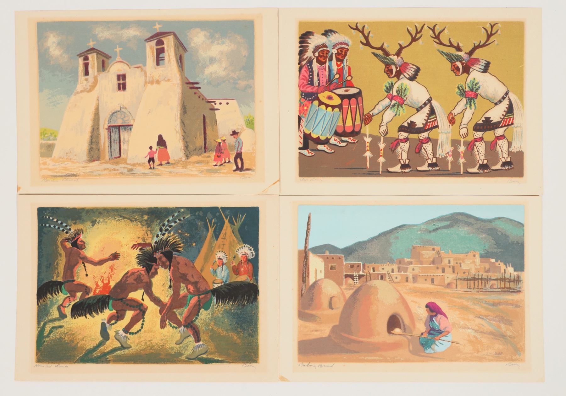 Artist Anna Barry moved to Taos, New Mexico in 1944 and began painting the local landscapes there. Here we have four prints depicting Taos life: the "Ranchos Church" which still stands and is re-mudded every year; Baking Bread; Horse Tail Dance; and Deer Dance. Each print is 6 in. X 8.5 in. signed in pencil lower right corner, and titled lower left. In very good to excellent condition, some toning, two with corners tape removed. Her works are shown in the National Gallery of Art in Washington, D.C. Please see photo for details.