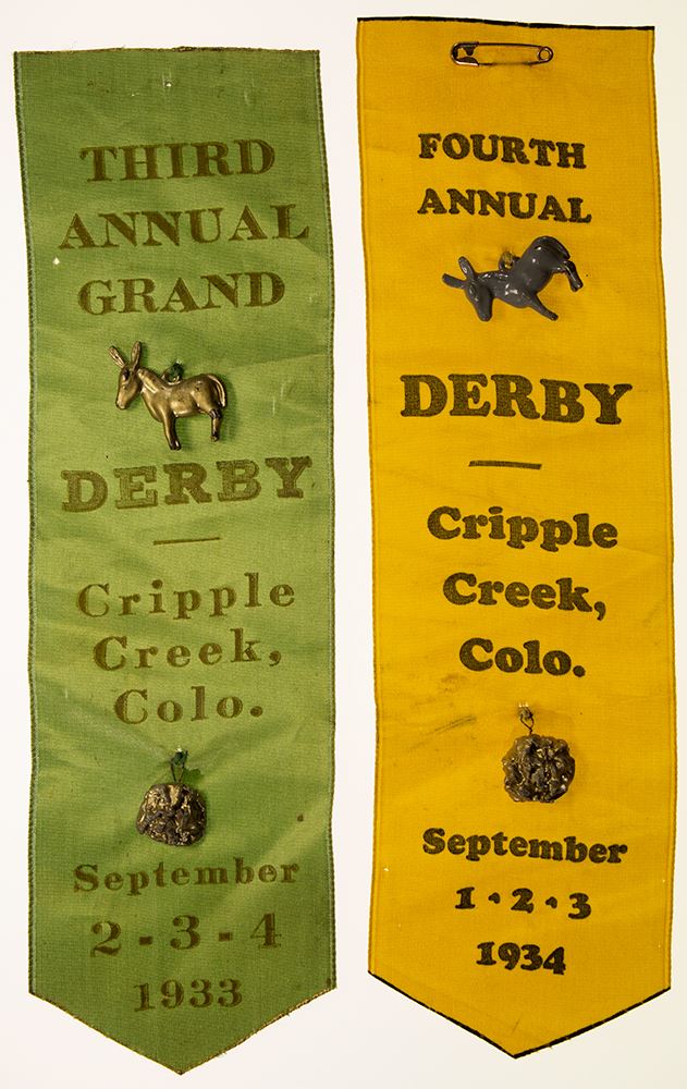 Group of 2 ribbons, both having a donkey and nugget attached to the ribbon, measuring 21/4" x 71/2" . 1) Green, Third Annual Grand Derby. Cripple Creek, Colo. September 2-3-4 1933. 2) Yellow, Fourth Annual Grand Derby. Cripple Creek, Colo. September 1-2-3 1934.