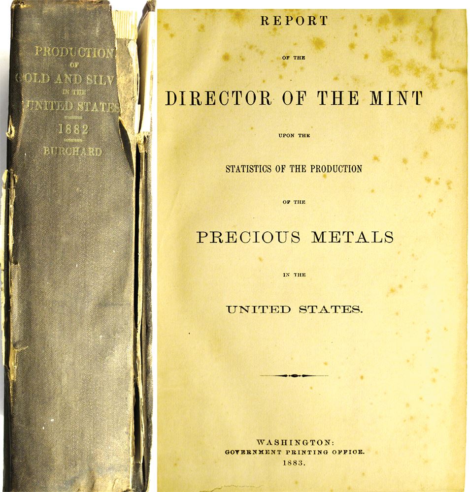 Annual Production of the Precious Metals in The United States by The United States Treasury, 1883. 871 pages- hardcover. This book provides 1883 information on production of mines, their locations, and precious metals in the United States. Mines, locations, and general subjects are indexed in the back. The cover is in jeopardized condition and the spine is in poor shape. The pages have some brown discoloration but the majority are in fair condition overall.
