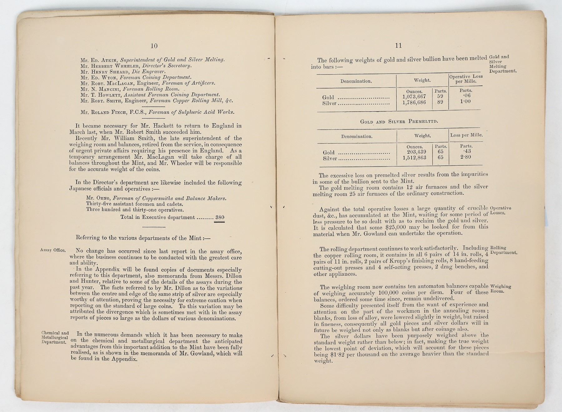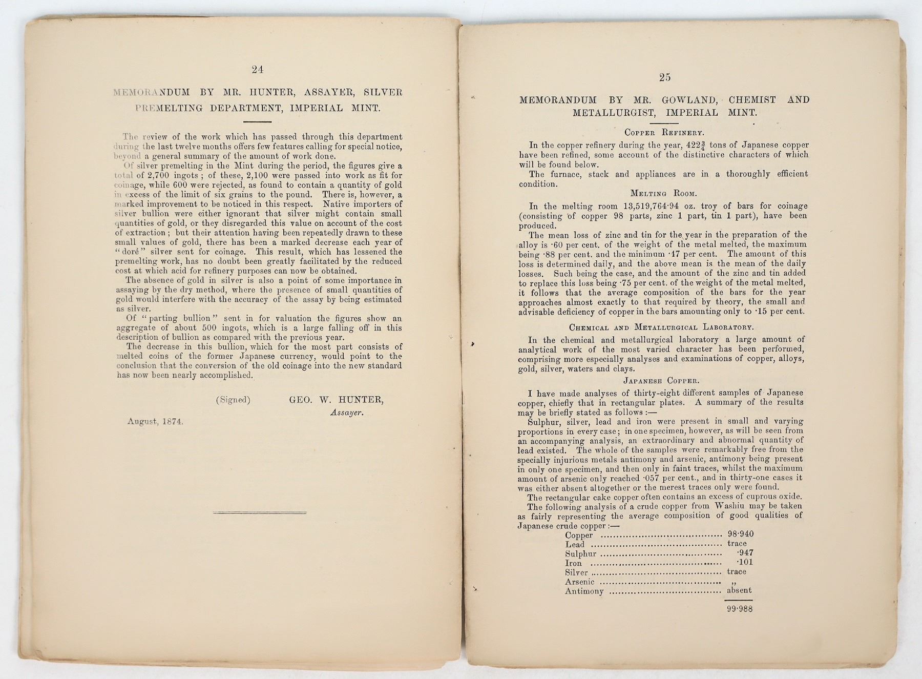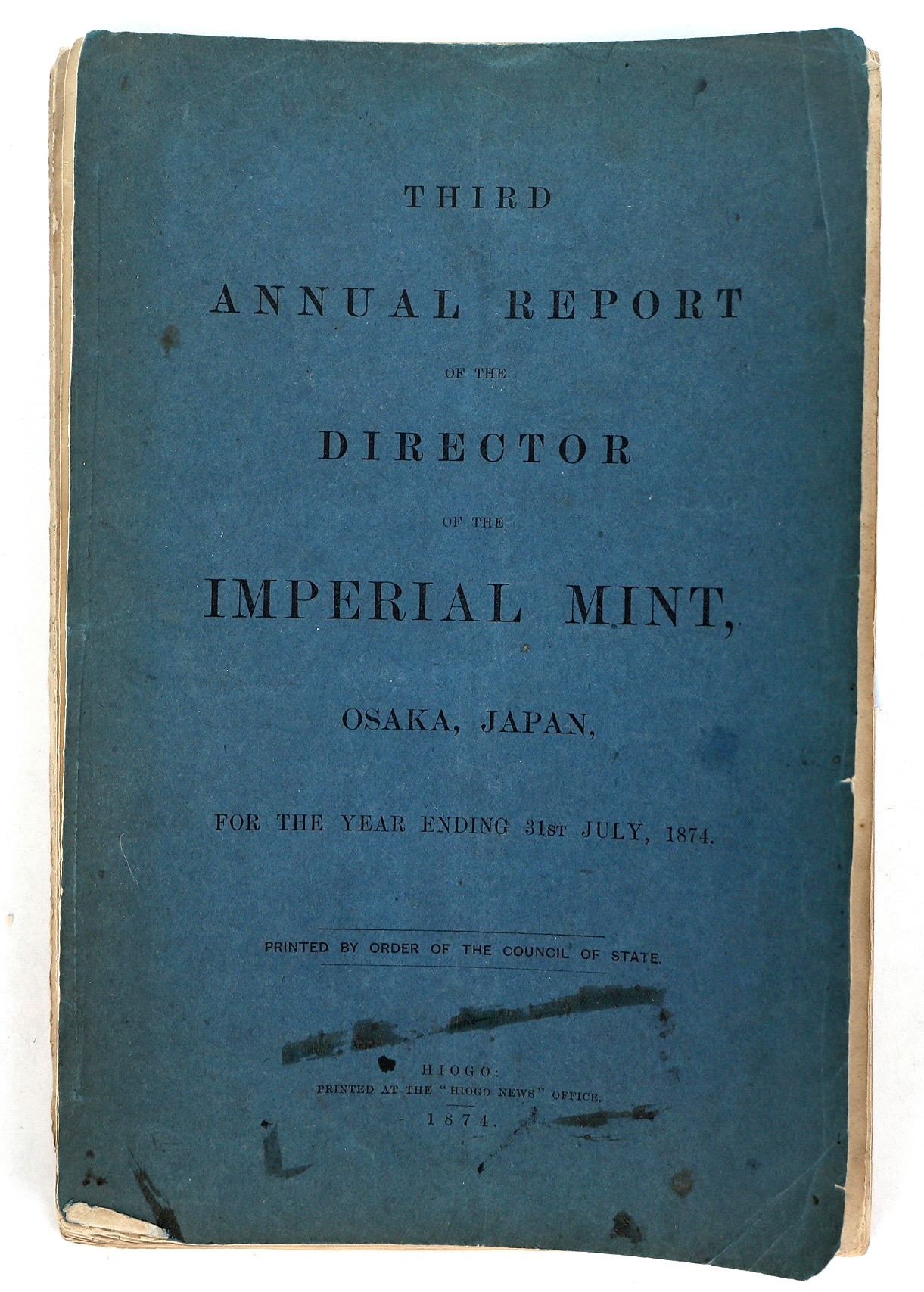 1874. The third annual report from Japan on the Imperial Mint, 1974. In plastic protective sleeve. Complete w/blue cover, binding is no longer holding, 32 pages. Some pages have sticky notes attached. In over all good condition, except for binding missing.