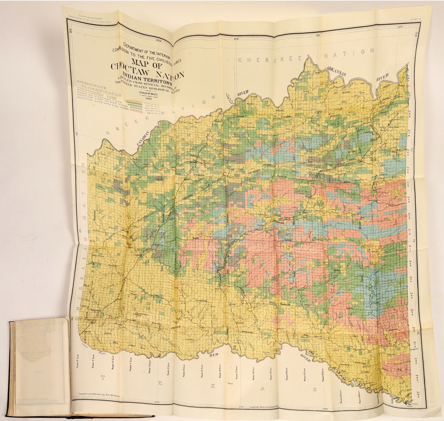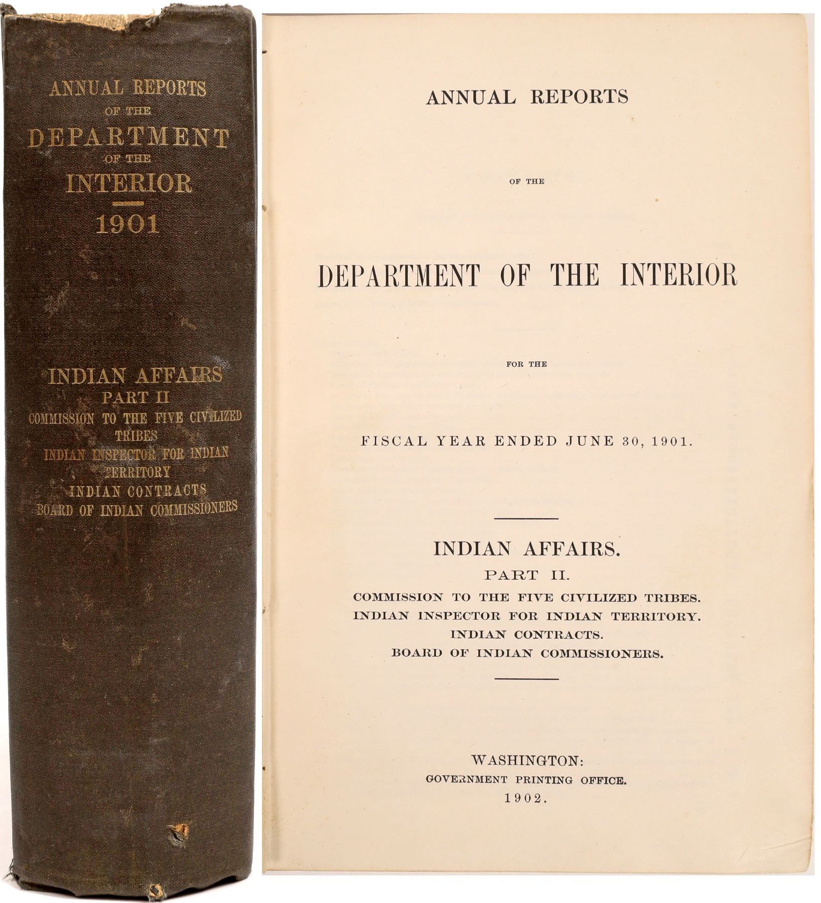 1) Annual Reports of the Department of the Interior, 1901. Indian Affairs Part II. Commissioned to the Five Civilized Tribes Indian Inspector for Indian Territory, Indian Contracts Board of Indian Commissioners. Fiscal year ended June 30, 1901. Washington: Government Printing Order; 1902. Includes fantastic groups of maps both back and white and color.