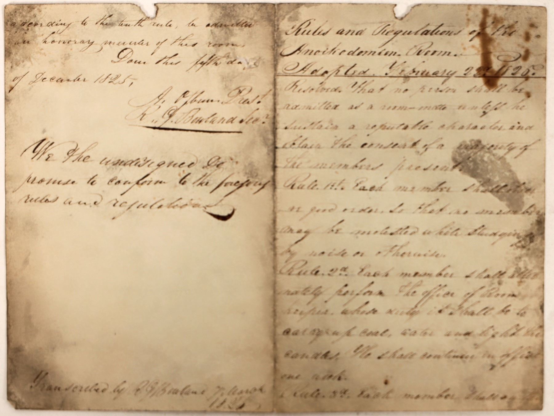 An 1825 transcript of the rules and requirements for membership in the 'Anoikodomeon Room', a Christian fraternal group. The transcription was taken down by an R.J. Bouland. Members are required to worship twice daily and recite memorized scripture in addition to memorizing passages of Walker's Dictionary, a reversed, rhyming dictionary of the English Language. In order to be admitted, members must swear to uphold the group's requirement and be accepted by a majority of existing members. "Aniokodomeo", Greek for "to build again", is a phrase used in an edition of the New Testament to refer to the Creation of Man. While no location is listed on the document itself, it came from a major Ohio archive.