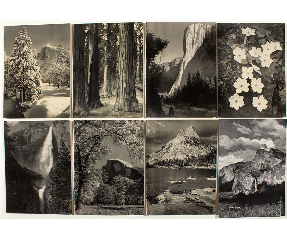 Adam got his start photographing Yosemite, and these Yosemite Ahwahnee menus feature his early photos. This lot has 8 different: 'Half Dome, Winter," "In the Mariposa Grove of Big Trees," one double-sided with a view of the valley floor, "El Capitan--Sunrise," "Dogwood Blossoms," "Yosemite Falls," "Half Dome, Autumn," and "Cathedral Peak--Yosemite High Sierra." All measure approx. 8.5" x 6.25" General condition is good, with some staining on backs. (Prag Collection)