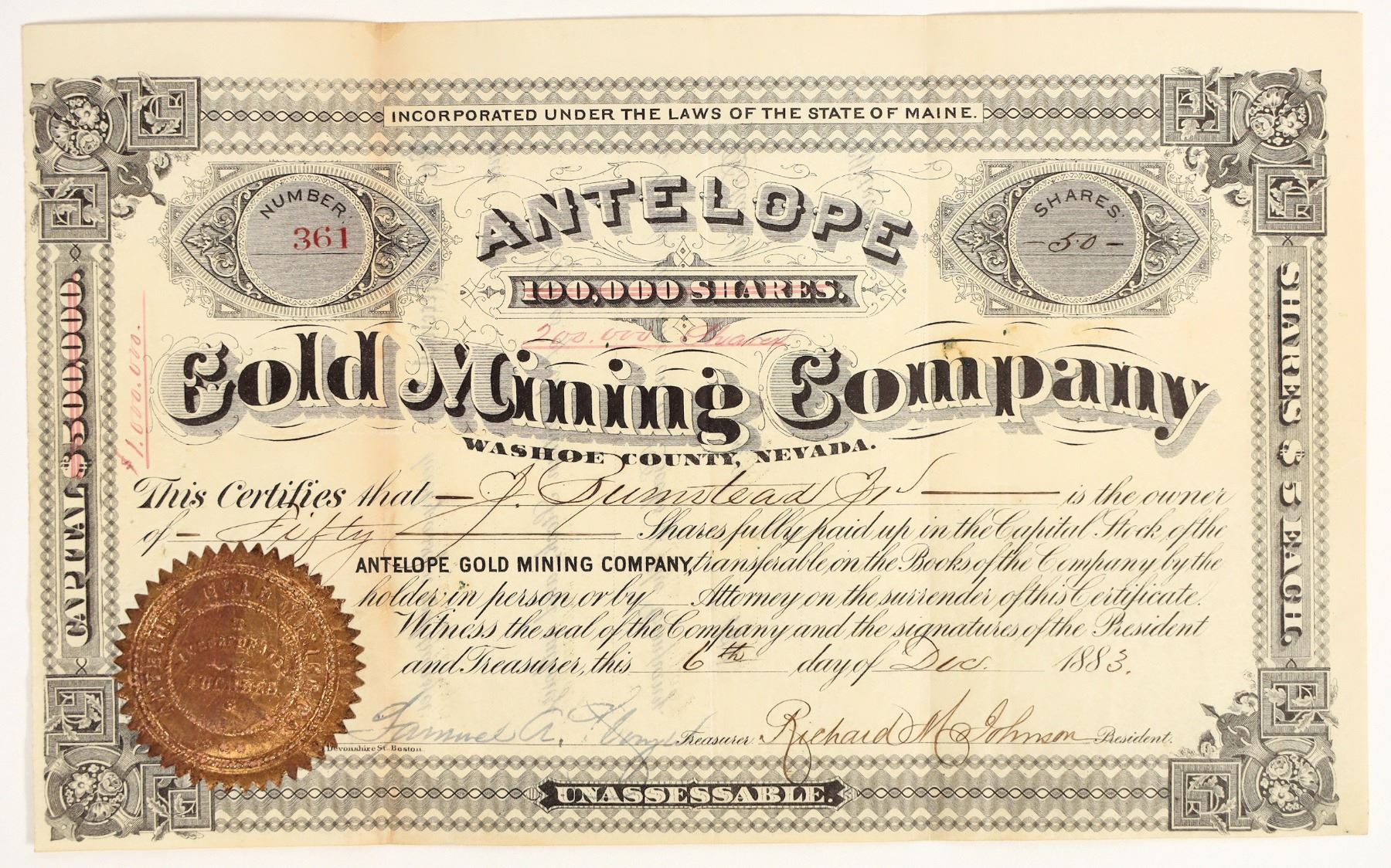 Very rare. "Washoe County, Nevada" printed under title. Inc. in Maine. No. 361, issued for 50 shares to J. Burnstead in 1883. Signed by president Richard M. Johnson and treasurer. Not cancelled. Ornate border, gold seal. Pinholes, deep folds with some discoloration along fold. 6 x 9.75" This company operated the Antelope (Mars-Homestake) mine some four miles east of Cold Springs, Washoe Co. (mindat.org). This is the only example of this variety recorded.